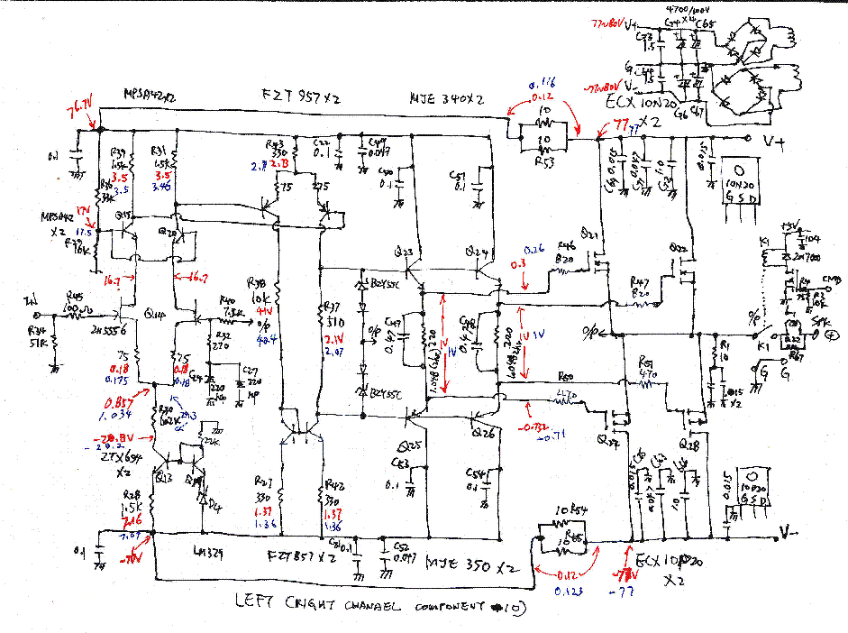 Nos, mégis sikerült beszélnem a szerzővel. Azt írta, hogy nem adja ki a kapcsolás rajzát, mivel nem akarja, hogy bárki változtasson rajta. Ez nyilván érthető is. Annyi iránymutatást adott, hogy a Goldmund erősítők irányvonalát követi a panel. Erről már találtam rajzokat. Érdekes felépítés. Az utánrajzolat természetesen nem az én munkám, de talán valósághűbb képet ad, mint a másik kép.