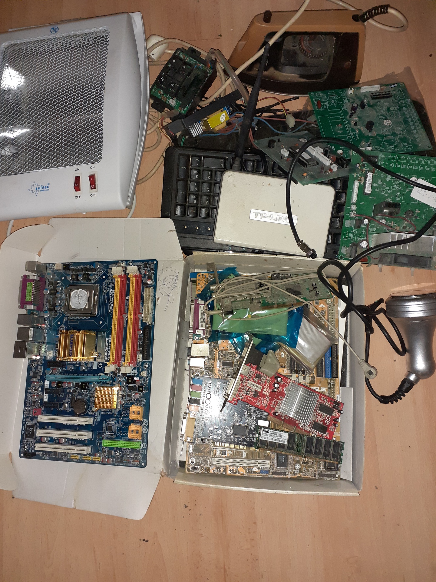Amúgy a vasaló működik, csak egyszer túlmelegedett. És az egyik billentyűzet új, csak PS2-es a dugója. A képen a penelek a kina maradékok, ilyen van néhány. |