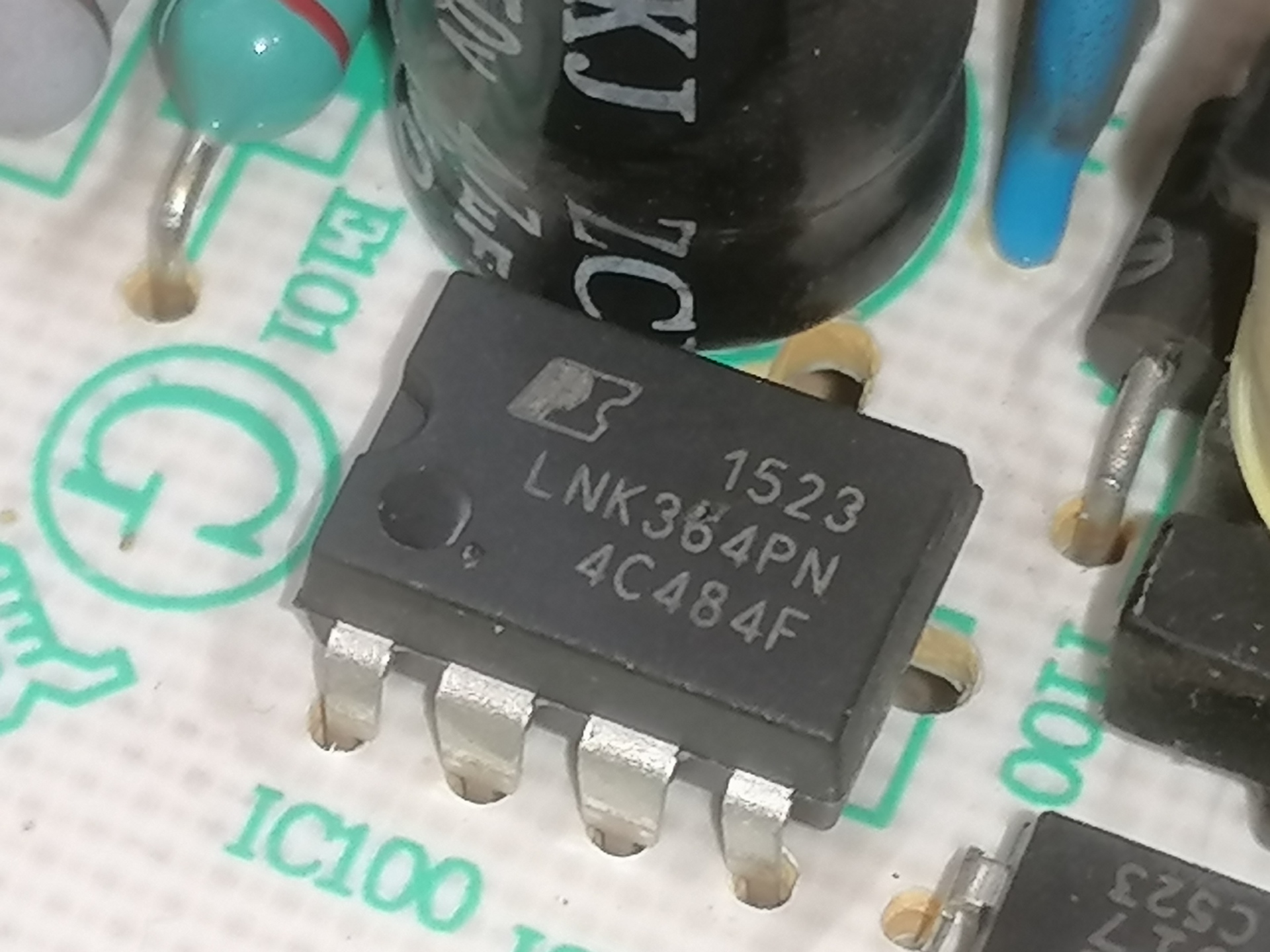 Természetes volt az egyenirányító kimérése, néha ha már egy zárlatos, cseréltem mind a négyet. Itt mind jó volt. A primer oldalon a felületen lévő alkatrészek jók. Van ott pár SMD alkatész is, azok is jók. LNK364 volt benne, itthon viszont LNK304 van. Beletettem ezt, de ennek is lerepült a teteje.
