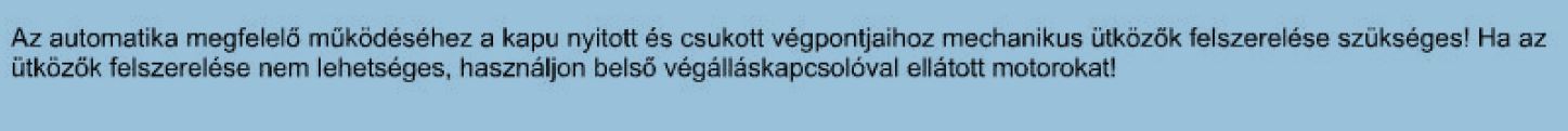 Bár a "kapu forgáspontja távolabb esik az oszloptól" egyáltalán nem értem... Ezen a problémán csakis a forgáspontok áthelyezésével lehet javítni, programozással nem. A vezérlő leírásának utolsó sorait csatolom... Mellesleg a kollégáim szokták a motorok felhelyezését/pozicionálását intézni, én csak "megfigyelőként" vagyok jelen. Persze több pozíciót is ki lehet próbálni, először csak ideiglenesen hegesztik fel a konzolokat. Ha nagyon "gázos" a helyzet, akkor átalakítjuk a kaput úgy, hogy jó legyen...vagy, ha a gazda "akaratos", akkor átadjuk a lehetőséget egy tőlünk "okosabb" csapatnak. (Bizonyára ezt is egy ilyen csapat szerelhette) ![]() Ilyen esetekben esetleg még a kb. kétszer annyiba kerülő csuklókaros kapumotor is alkalmazható (jó párat felszereltünk már)...nyilván a magasabb ár miatt, ezt is kevesen választják. A földbe süllyesztett motorokat már megsem említem... De azért még egy "ütköző" megoldást megmutatok A hozzászólás módosítva: Máj 19, 2021