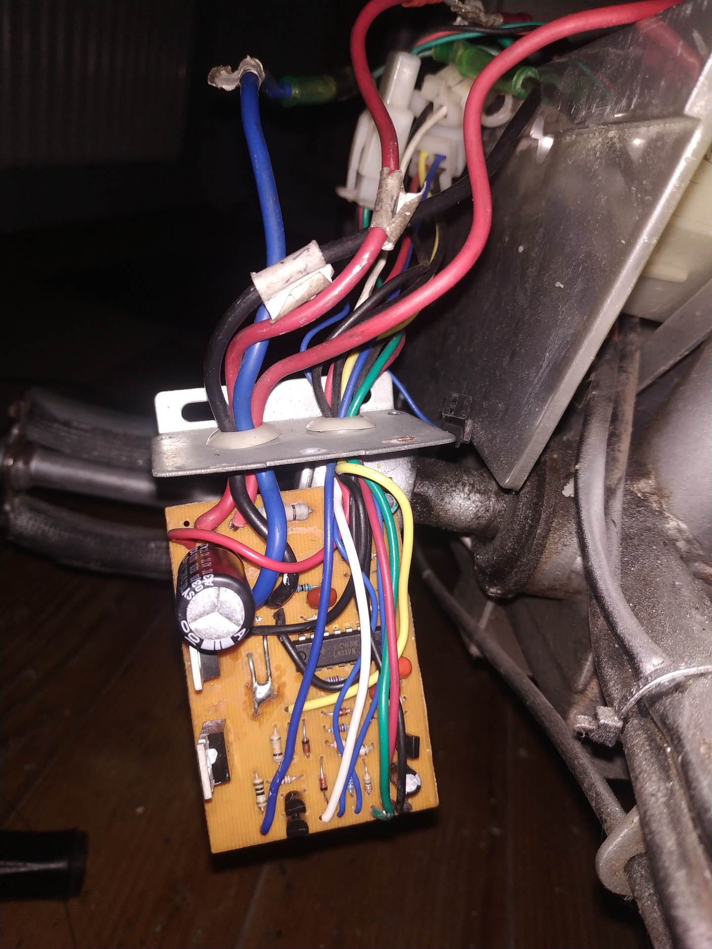 A kép felső részén egy 440ohmos ellenállás van. Az egész vezérlő előtt van egy olvadóbiztosíték 15A de ez nem olvadt ki. Van egy komolyabb vezérlőm is másik bringából de annál 3 vastagabb vezeték megy a motorhoz és 5 vékonyabb. Ennél csak két vastag vezeték megy a motorhoz. Neten sem találtam komolyabb vezérlőt aminél ilyen a vezetékköteg. Leszedtem az ónt de nincs valtozás. Holnap kicserélem a mosfetet.