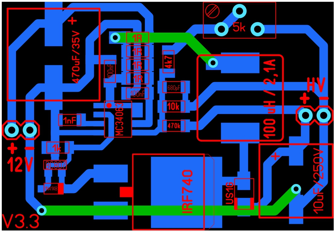 Egy kapcsolóüzemű áramkört pontosan kell tervezni a kimenő feszültséghez és terheléshez, ha 200V és 30mA kell, akkor ne 230V-ra és 45mA-re tervezd! 100uH tekercs mellé jó nagy frekvencia kell, az 1nf TC kapacitás sok, oda inkább 330pf, vagy maximum 470pf legyen. A nyákterven túl vékony a GND amin nagy áram folyik és ez gyakran okoz instabil működést (ha cicereg, vagy zúg a tekercs, akkor biztos, hogy nem stabil). A betáp pufferének negatív kivezetéséhez minél közelebb legyen a FET és nem árt még egy 10K ellenállással földre húzni a FET gate-jét, továbbá egy soros 10-47ohm ellenállás is segíthet a gate-en, így valamelyes csökken a csúcsáram a FET bekapcsolásakor.