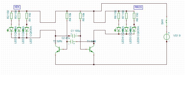 Alabb vannak is rajzok (astabil), ebbol ketto kell (pld. a duo led villogo). Az elso egy aszimmetrikus astabil a masik meg egy szimmetrikus. Az elsonek a kitoltesi aranyat ugy valasztod meg ahogyan neked megfelel. Ez utobbi vezetli a masodik astabilt egy tranyon keresztul amely bekapcsol egy kis idore es a led felvillan egy parszor.
