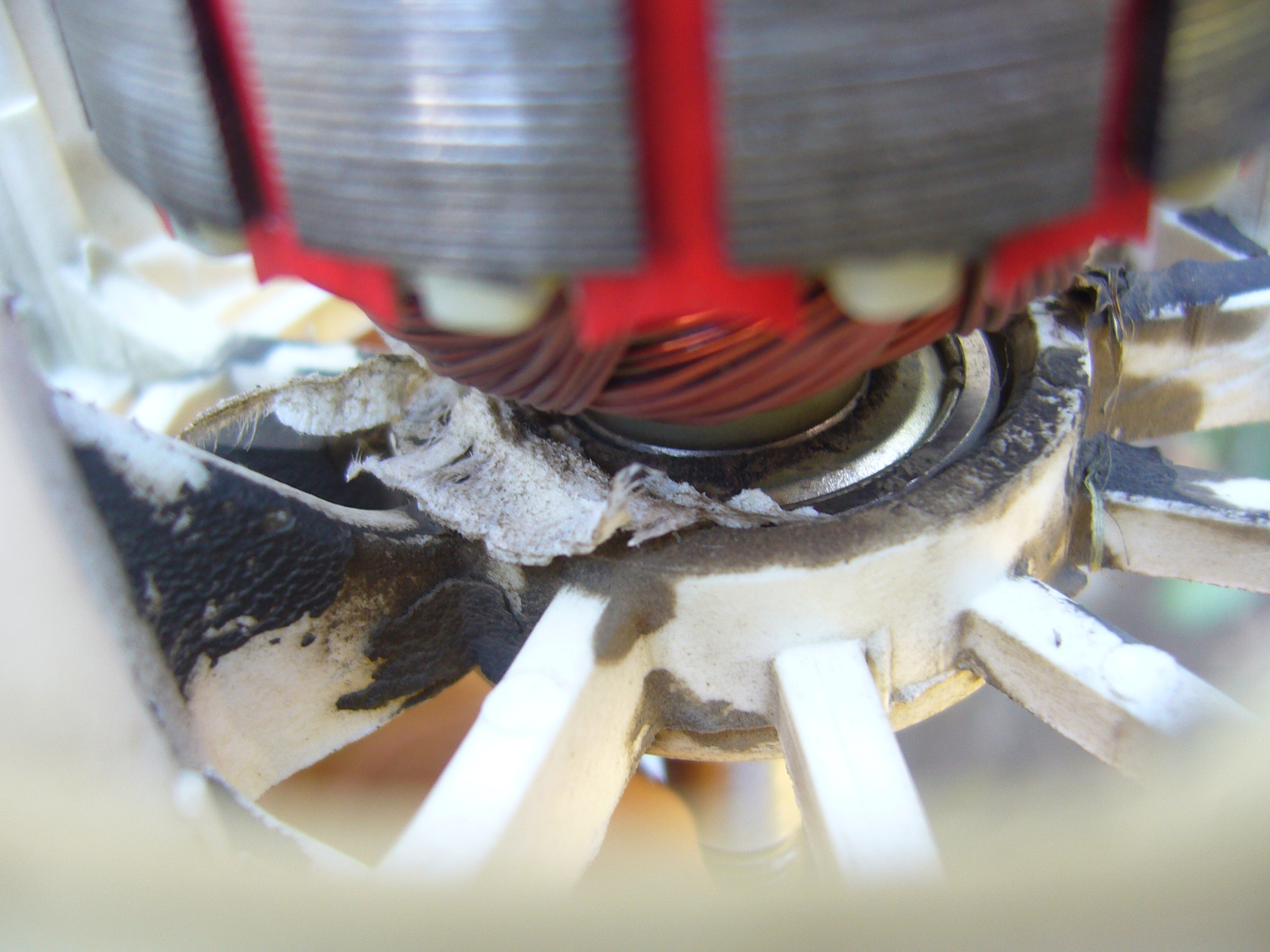 Közelebb kerültem a problémához. Kis agyalást követően meglepően könnyen közelebb jutottam a gyanusított csapágyhoz. Ami valóban a tipped igazolása, azaz hogy a csapágy gyönyörűen megragadt, a további forgás pedig pillanat alatt megolvasztotta a csapágyházat, és ki is tolta a műanyagot. Íme. Következő lépés a rossz csapágy kiütése után immáron nem bontási, hanem visszaépítési folyamat lesz. A műanyag csapágyház pótlása (bejlagolás amit sajnos a videón nem látunk), esetleg kevéssé elegáns módszer lehet az új csapágy kétkomponensű ragasztóval való beágyazása a helyére, "oszt" megy ameddig megint meg nem makkan? Nem tudom, hogy csinálnád?