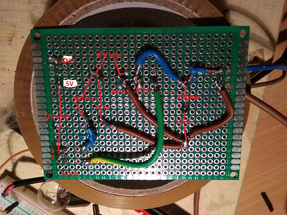 Annyiban nem egyértelmű a rajz, hogy a MOC-ból a triac gate-re kötött vezeték csatlakozik-e az N vezetékhez vagy nem. Olyat láttam máshol, hogy egy ellenállással le van kötve, de ilyen sima csatlakozást még nem.