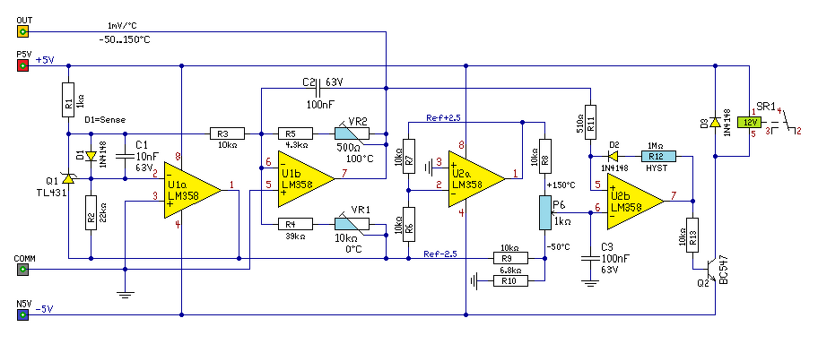 Hello! Én szívesen rajzolok hozzá, egy komparátort, de azért ez az áramkör nem lesz egy csoda. Mert igaz hogy egy dióda nagyon olcsó hőérzékelő, de azért nem a legjobb. Mert a hőmérséklet változása -2mV/°C körül van, az egyszerű OPA offset feszültsége pedig 3..5mV körüli. Mivel itt a kimeneti jel a Digit-hez van igazítva, a kimeneti jel amit a 7107 mér, az 1mV/°C.