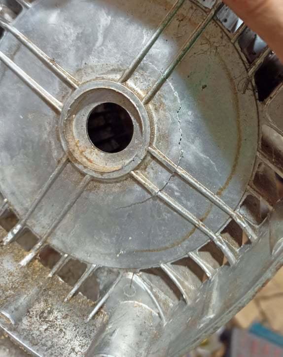 Miután sikeresen újracsapágyaztam már vagy egy tucat aszinkronmotort, ezt a 3 kW-os orosz példányt tönkretettem. Ennek oka az volt, hogy csak az egyik pajzsa levehető, a másik az állórész aluöntvény házának része, és ennélfogva egy "vak" csapágyházba kell belepréselni (és nem beleütni....) a forgórész előzőleg megcsapágyazott tengelycsonkját. volt a csapágyházban egy körkörös hézagolólemez, valószínűleg ezt nem találta el tökéletesen a csapágy, így kicsit erőltetni próbáltam, mire a képen látható módon kitört a csapágyház fedele. Szerintetek javítható-e valami ügyes TIG-hegesztéssel, és ha igen, érdemes-e foglalkozni vele? Köszi a válaszokat!