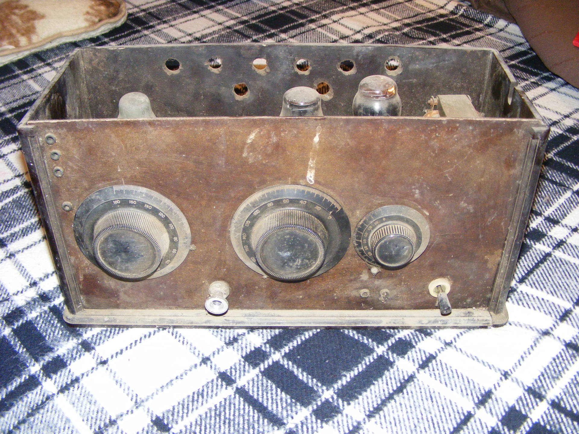 Igen egy idős úr készítette még nagyon régen. Báriumcsövekkel szerelt, de van benne egyencső és hálótrafó is. Ha jól láttam fejhallgató és hangszóró is köthető rá a hangszórónak van kivezetve anód (gondolom gerjesztett vagy lengőnyelves).