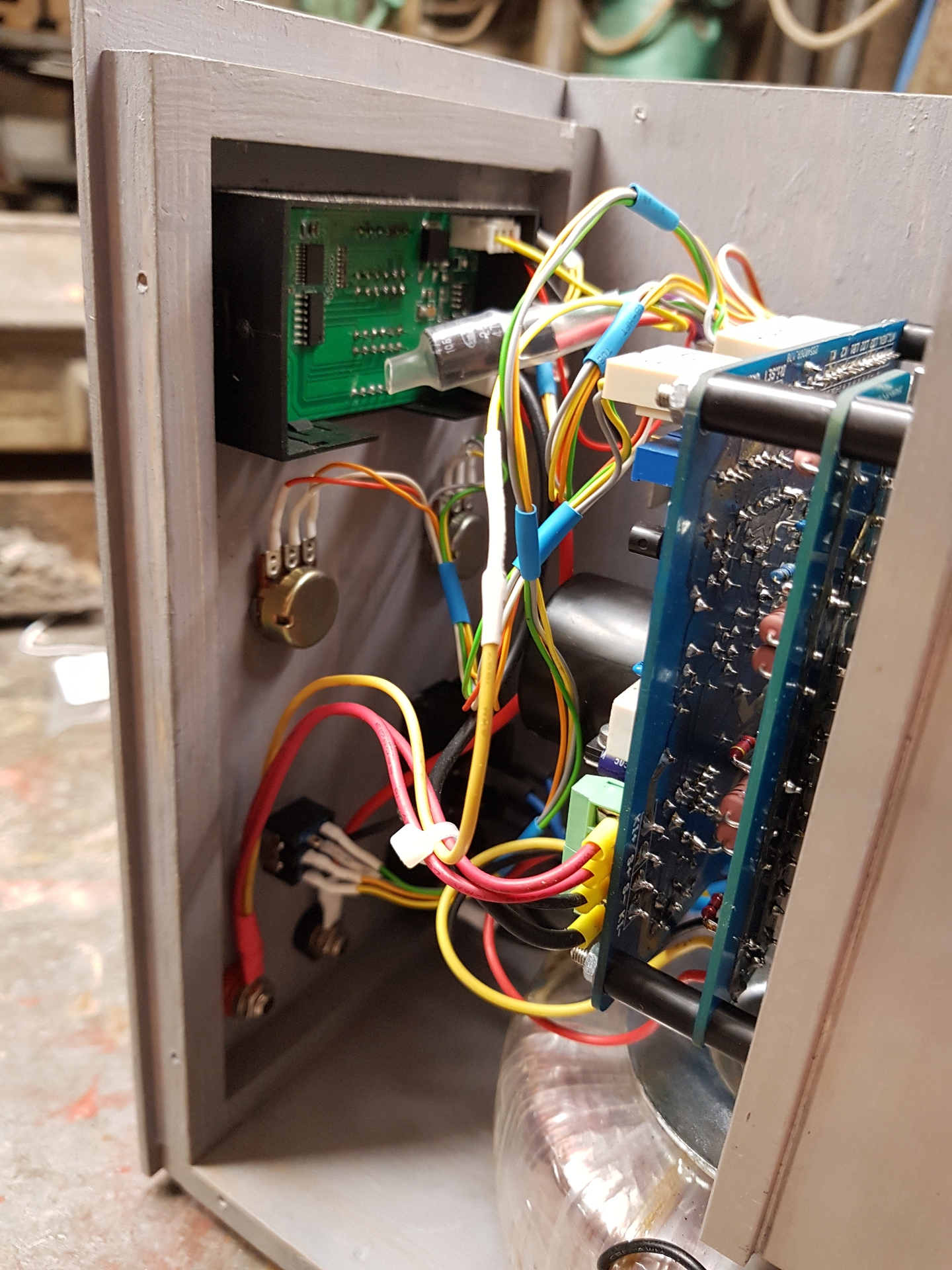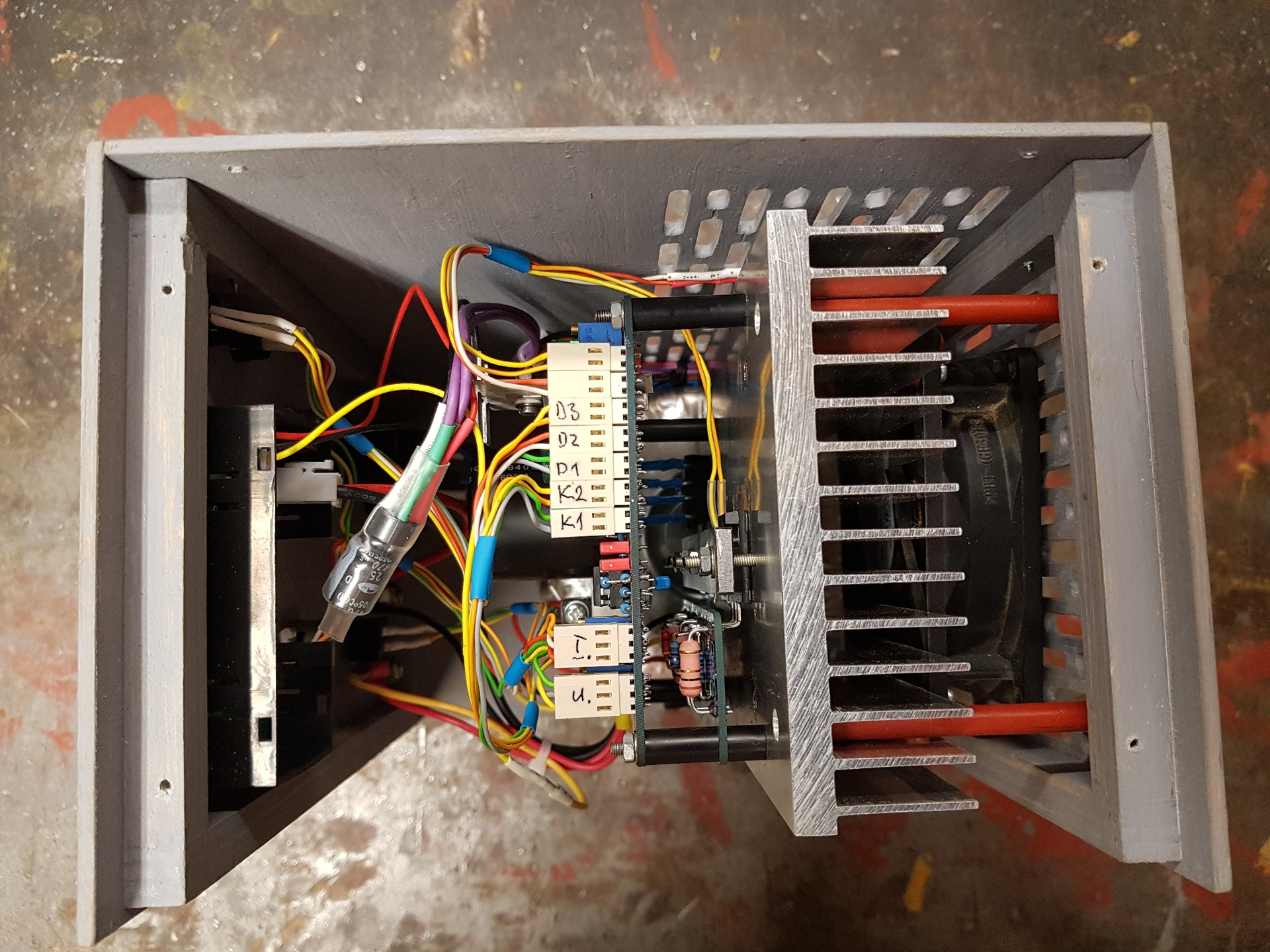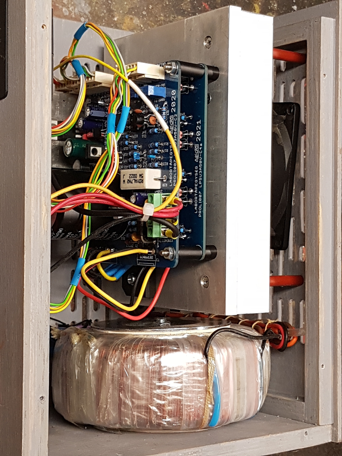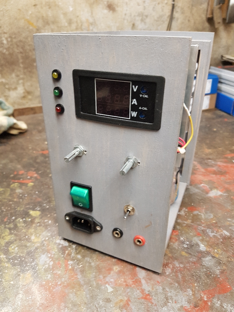 Összeraktam egy komplett példányt az LPSU-ból, segédpanelt használva a FET-ek háromszorozásához. Ez is csak egy fadoboz, de a szellőző lyukakat egyesével vágtam ki lombfűrésszel, tehát a munkát belefektettem.