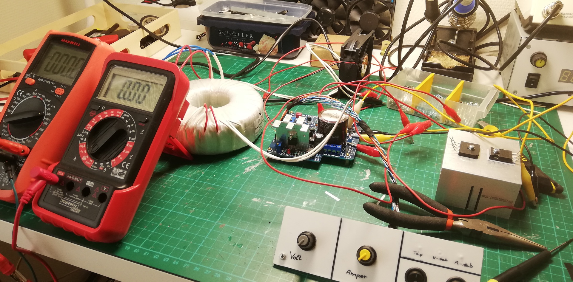 A potit még nem próbáltam gyakorlatban, majd akkor ha már lesz egy táp ami legalább az asztalon össze van drótozva. Bár abban igazatok van hogy két poti valószínűleg elegánsabb és egyszerűbb.