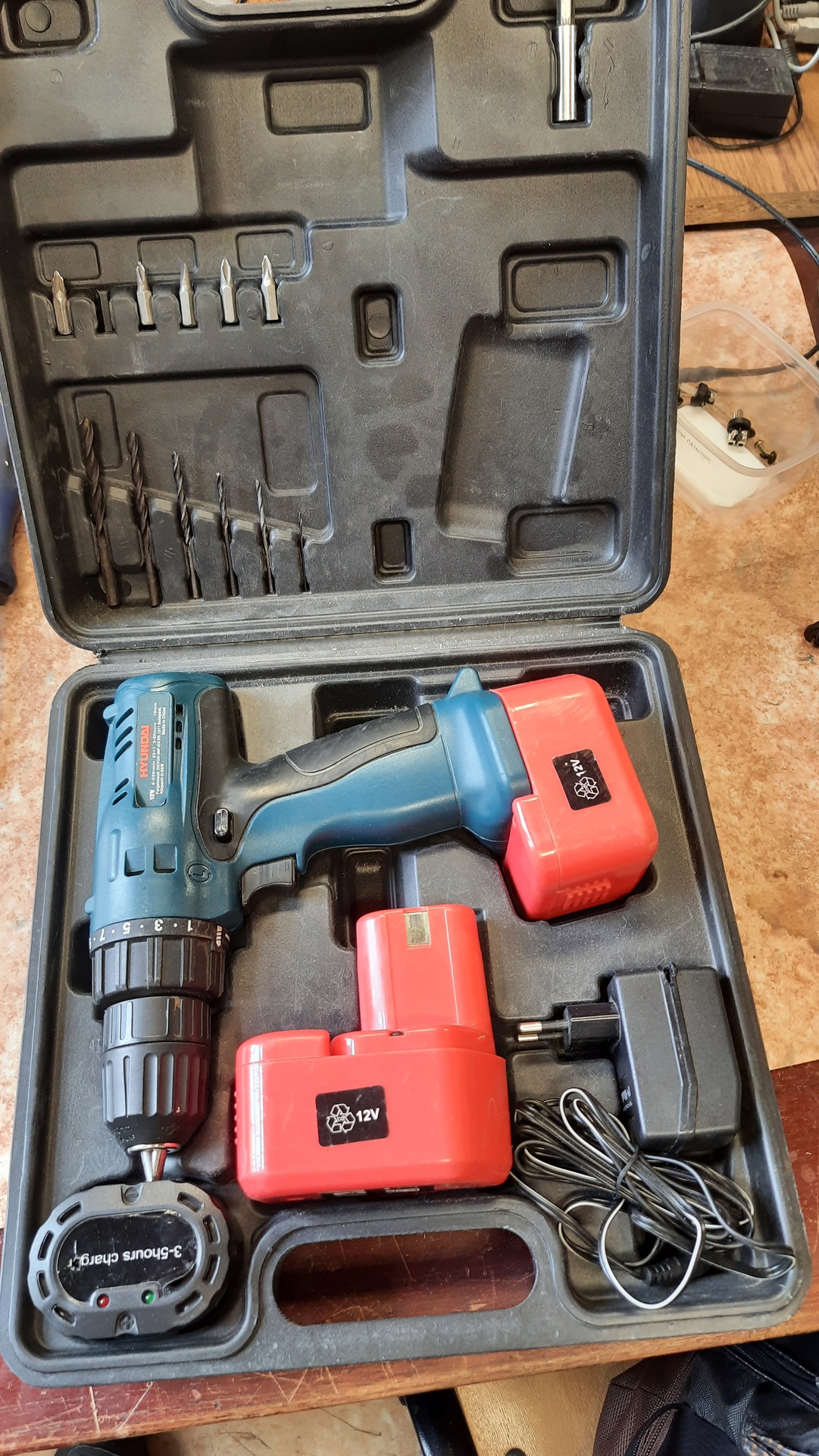 - akkus fúrógép/csavarozó (aksija halott, töltő zárlatos, a tokmány új korában is kotyogott