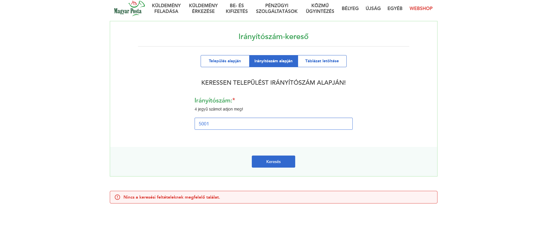 A postai irányítószám-kereső nekem azt írta, hogy nincs a keresésnek megfelelő település...