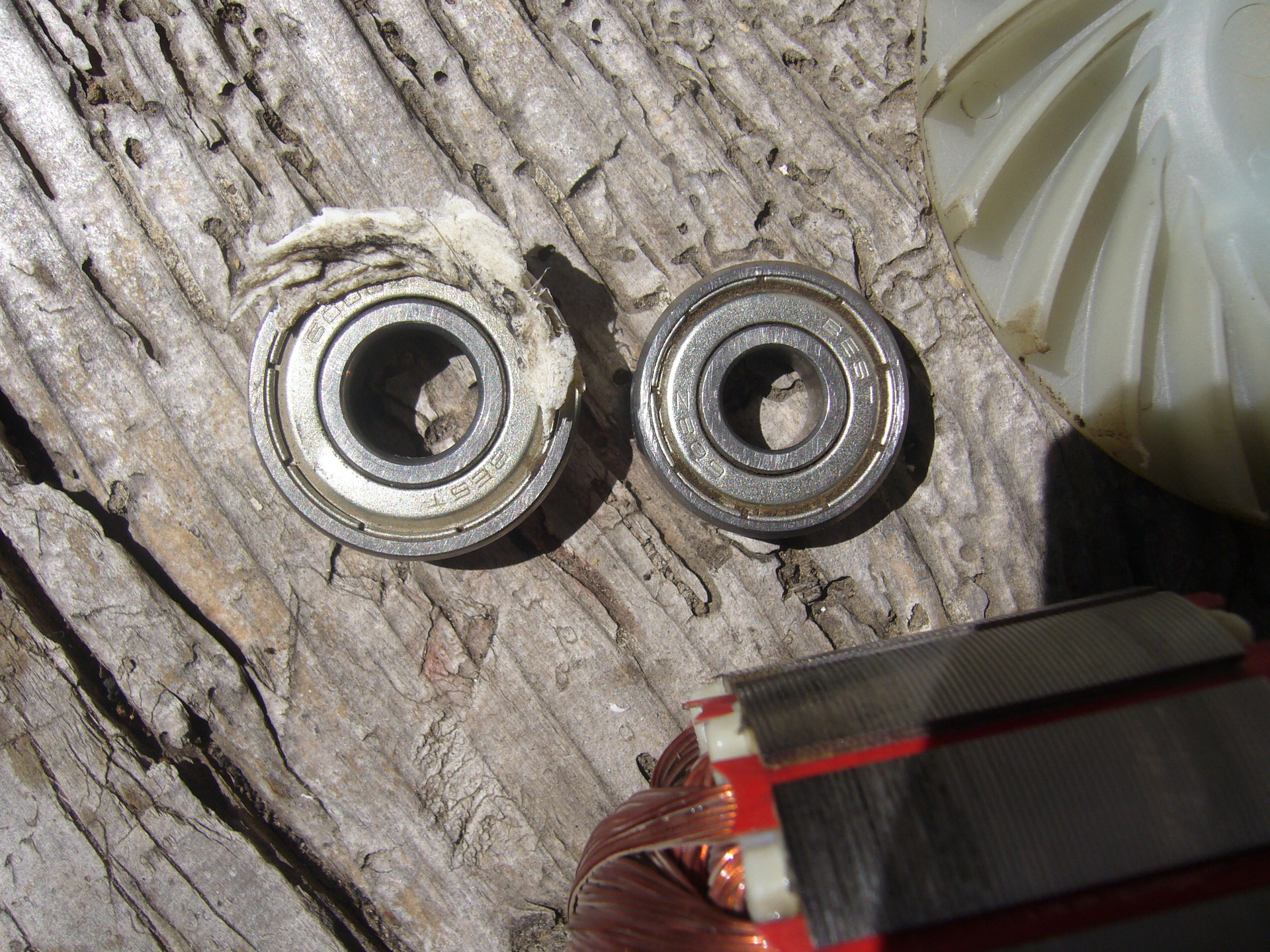 Jobban megnézve 3 kis csúszkáról tört le, nem 4. Amúgy a csapágy teljesen be van ragadva, kivettem, maga a csapágyház így néz ki. Levettem a felső csapágyat is, mert habár forog, de igencsak "karmol" már az is.