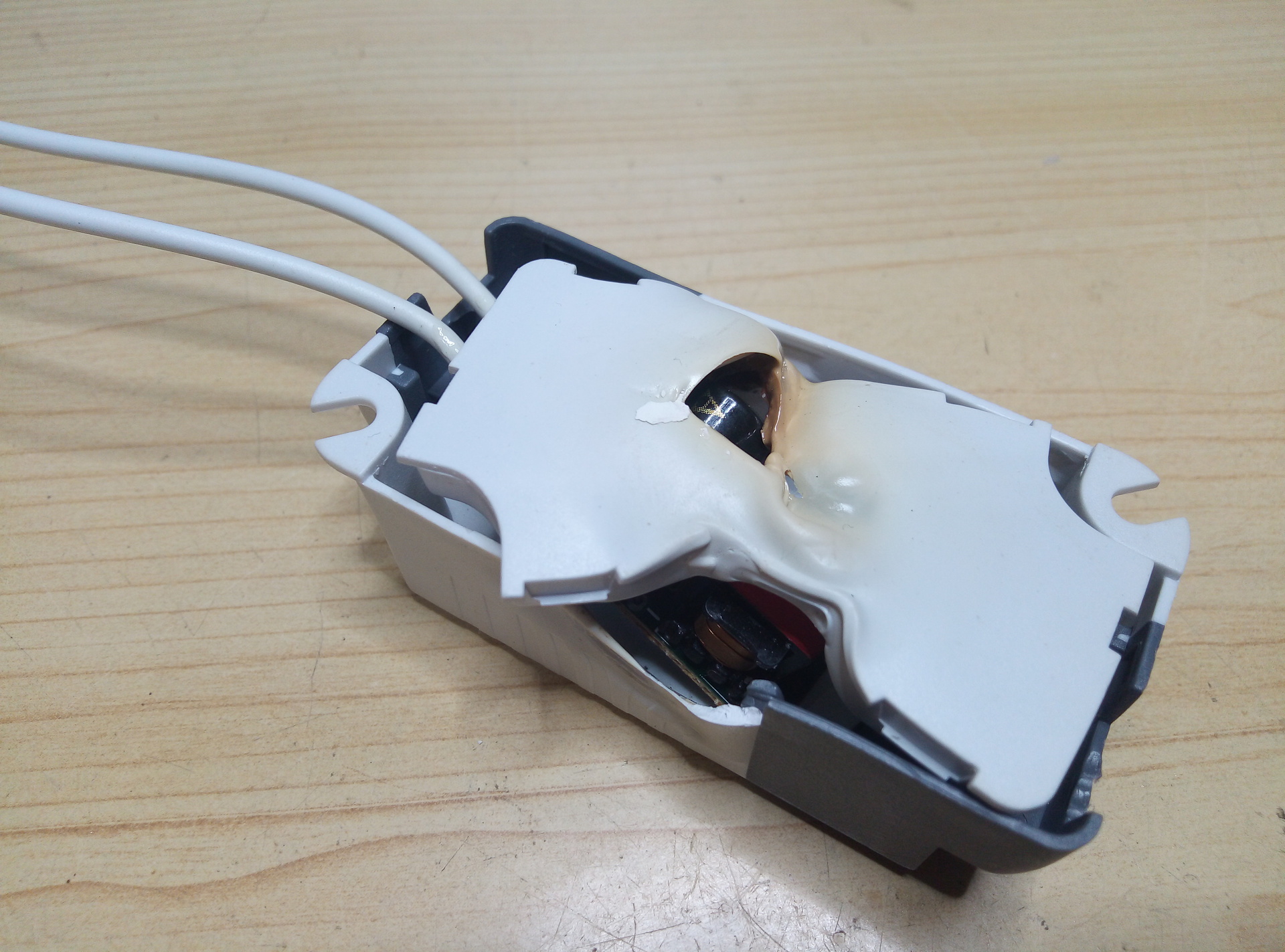 A mellékelt képeken egy 230V-os áramgenerátoros LED driver látható. Egy jókora durranás kíséretében semmisült meg. Jól látható, hogy nem kis hő keletkezhetett benne. Ennek ellenére még a fölötte lévő hungarocell szigetelésen sem és a lámpán sem látható hőhatás nyoma.