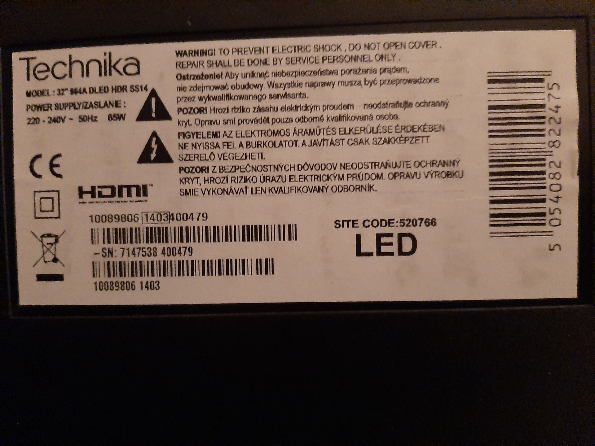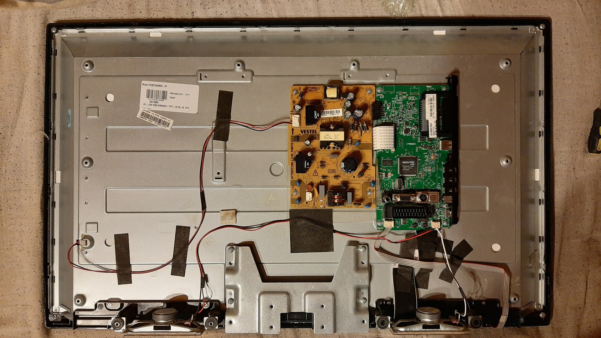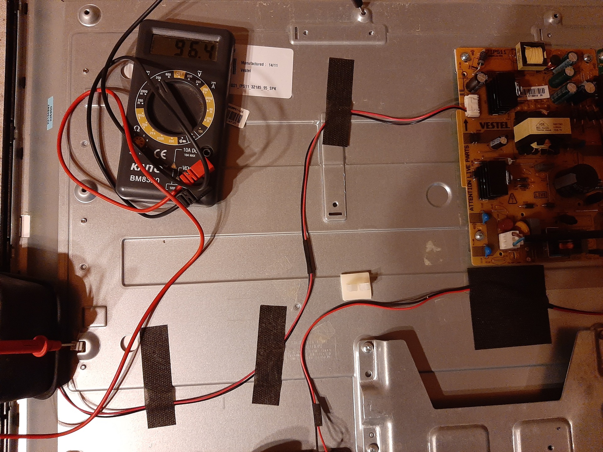 Azzal fordulnék most hozzátok: Szereztem egy "Technika" nevezetű TV-t, mert ingyen volt, mert nem működik. (1. kép) (Gondoltam, érdemes elhozni, hátha ennek is csak olyan hibája van, amivel én is tudok valamit kezdeni) Úgy néz ki, a háttérvilágítás hiányzik, mert ha belevilágítok elemlámpával a képernyő közepébe, akkor látszik, hogy: "nincs jel" (2. kép) Szétszedtem, hogy lássam, miért is nincs. Úgy gondolom a mérésekből, hogy a táp rendben van, a háttérvilágítás felé menő "madzag"-nak a feszültsége bekapcsoláskor felszalad kb 100V-ra a tsthez képest, majd fokozatosan visszacsökken 33,5V-ra. (3. és 4. kép) A két kivezetés közt nincs feszültség. (5. kép) Mivel áramot nem mérek rajta (hiába iktattam be az egyik szálra vezetékdarabot, a másikra a "multit" árammérés-állásban, ezért: Jól gondolom én azt, hogy csakis a "led-szalagok"-ban lehet a hiba? (Egy-egy led megszakadhatott, ezért nincs áram sem) A hatodik kép csak a TV belsejét mutatja.