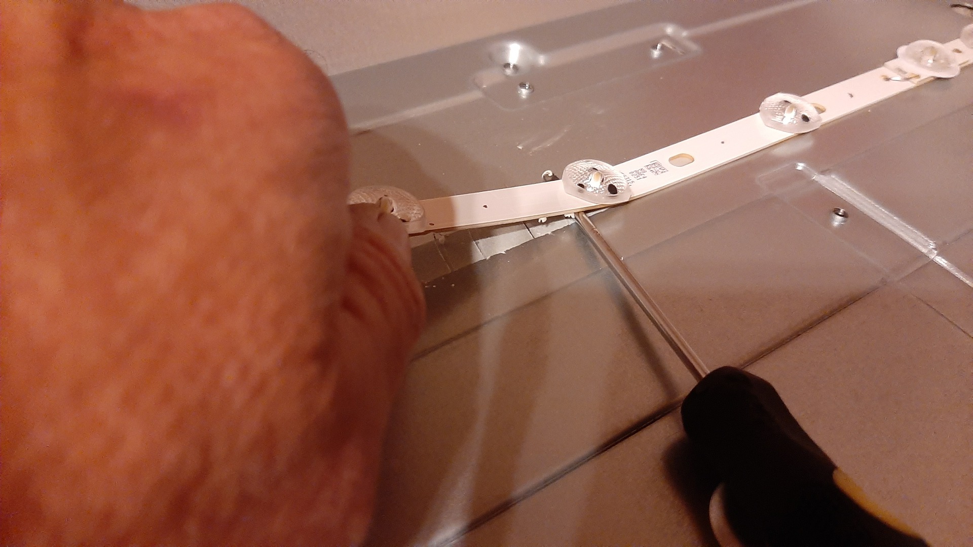 A 3. képen talán jól látható (vagy csak én hiszem azt, hogy jól látható), az a sok kicsi fül, amiket kinyitogatva szétjön a "káva" és ez a hátsó fémvályú (amiben a ledek laknak). No, amikor visszatettem, az oldalsó kis füllencsek simán visszapattantak, a felsők és az alsók csak feszegetéssel.