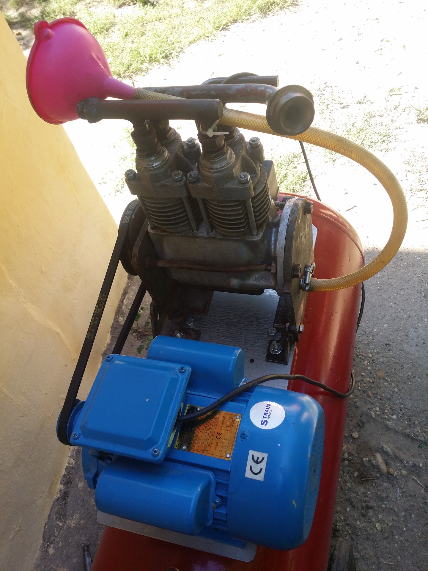 Ugyanabban a cipőben járunk. Az én konstrukciómban egy 2.5kw-os, 3000 fordulatos 1 fázisú motor hajtja a Jikov 67A sűrítőegységet. Az üzemi fordulatszáma 1460 1/f, ami már majdnem sok egy kicsit. Ha megnézed az eredeti motorról készült képet,akkor láthatod,hogy az adagolóról kapta a hajtást,ami ugye a főtengely fordulatszámának felével forog. Ugyanakkor nagy köbcenti,ergó alacsony fordulatszám.... szerintem kb 1000 lehetett,max 1500. Viszont,ami érdekelne,az az olajszint! Valakinek van ötlete,hogy meddig kellene töltenem a forgattyúsházat?