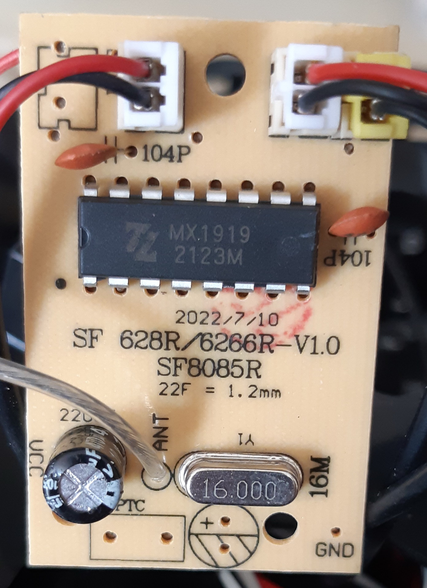 Egy AVR vevő 2,4 GHz-re ahhoz van a 16 MHz órajel kvarc A jelöletlen chip a másik oldalon 2,4 GHz-es vevőegység, a 2 motort pedig MX1919 (más néven MX1515) vezérli. Az autót párhuzamosan két 3,2 V-os LION cella hajtja.