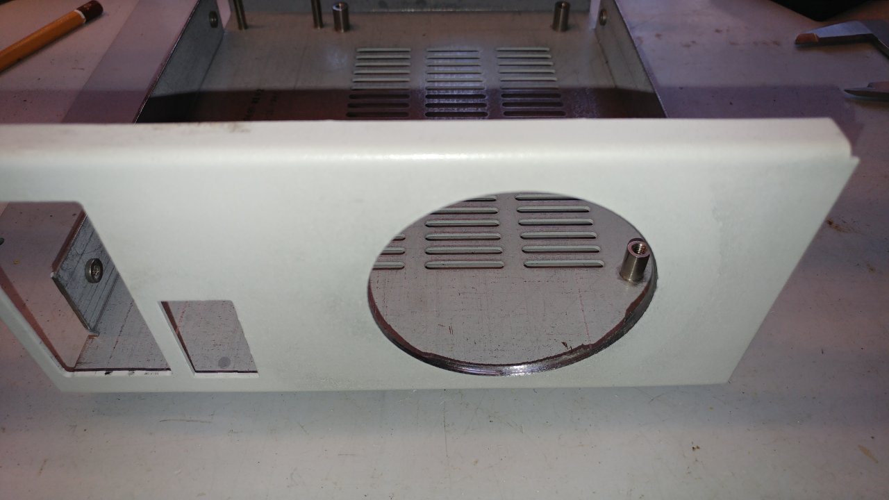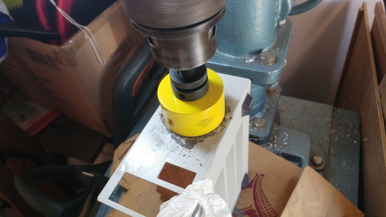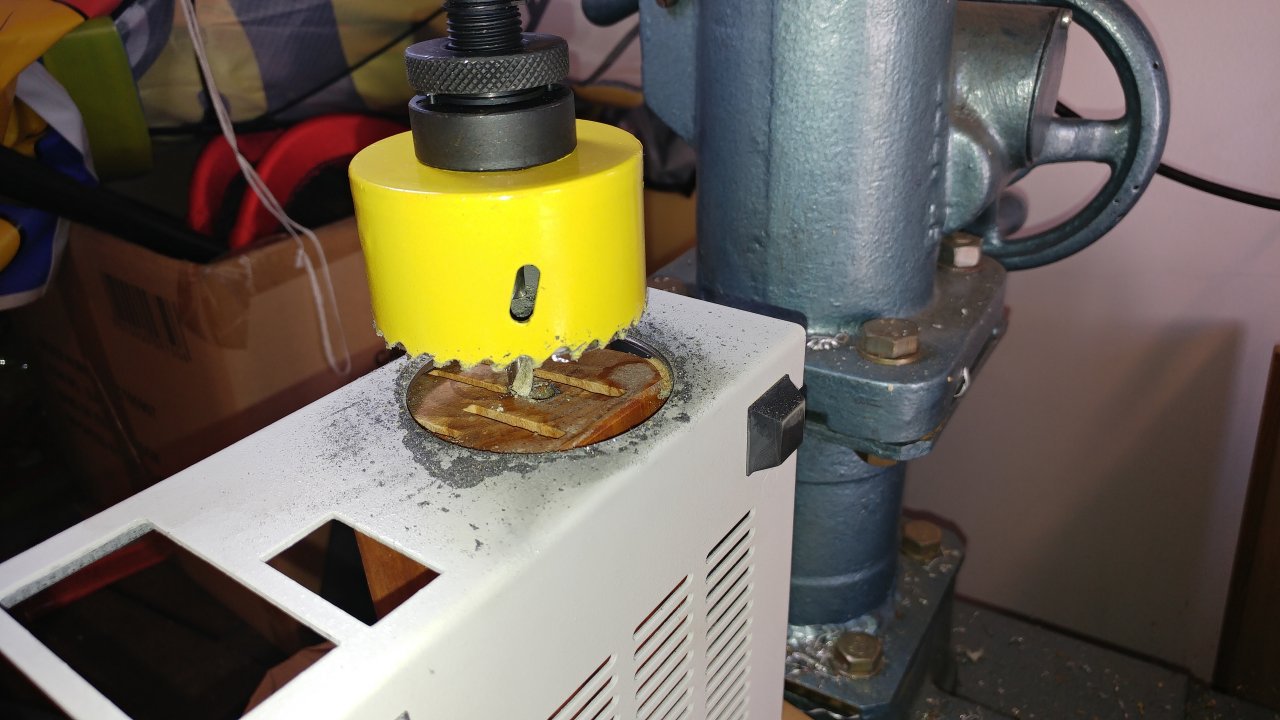 A doboz U alakú részének előlapját pillanatszorítóval lerögzítettem, a hátlapot pedig alátámasztottam egy rögtönzött fa darabbal, majd a festéket óvva a felső felét még egy kombinált fogóval is fogtam. Nem a legjobb rögzítés egy ilyen labilis szerkezetnek, de a célra megfelelt. A furat 64mm-es HSS bimetal körkivágóval készült, kb. 100 1/min-re beállítva a fordulatszámot. Ezen a kellően alacsony fordulatszámon szépen működött a dolog. Gyakorlatilag megakadás nélkül megvolt a kellő nyomaték a folyamatos forgácsolásra. Kicsit féltem amiatt, hogy az fa alátámasztás miatt a doboz felső lapjának síkja nem volt 100%-ig merőleges a fúrásra, ezért a lyukfűrész egyik része előbb átért az anyagon, de itt sem volt semmi akadás vagy probléma, szépen átment mint kés a vajon, a kis fordulat miatt pedig a fúrás mellett az eredeti festés is sértetlen maradt, nem égett meg. Frekvenciaváltó nélkül a szíjáttétellel elérhető legkisebb fordulatszám általában valahol 450..600 1/min körül van. Ez amúgy is messze van az ekkora méretre ajánlott max 165 1/min-es fordulatszámtól, szóval frekvencia váltó nélkül ez gyakorlatilag normálisan nem kivitelezhető művelet lett volna. Elégedett vagyok az eredménnyel.