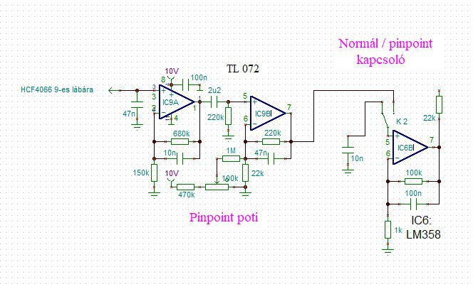 Haladtam,készen vannak a panelek,be is kötöttem mind a kettőt.Tápfeszültségek rendben mindenhol.Gép bekepcsol,megjelent a magasabb hang csak az a baj,hogy a vasra is meg a nem vasra (réz,ezüst,stb.) is ugyan az a hang.Talaj kiszűrve,téglára nem jelez és az érzékenysége légteszten kb. 8 cm csökkent az előtte lévő állapothoz képest.A gép áramfelvétele kb. 6-8mA nőtt,de ez szerintem elfogadható.Próbáltam a pp. áramkört is,nincs siker!Átkapcsolva tűpontra folyamatosan sípol,pedig nincs a fej előtt semmi,igaz akkor is sípol,ha bármit elé teszek és mindegy,hogy mozgatom vagy sem.Most vagy kevés a pp. bemenetén a 100K ellenállás,még nem volt időm módosítani,vagy nem jó a CD4053 kapcsolója ide,többször ellenőriztem,kicsipogtattam a megbeszéltek szerint kötöttem be.A pp.-n lévő 100K trimmerre nem reagál.Asípolás akkor is megjelenik a hangszóróban,ha a pp-nek nem adok tápfeszültséget.Mellékelem a pp. kapcsolását és panelrajzát,nézzétek meg,hátha elsiklottam valami felett.