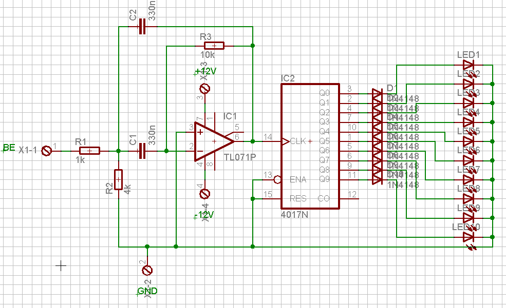 Hát ez az egész így nem jó! - A szűrőnek, csak egyszeres az erősítése, az RCA-ról, meg csak pár száz millivolt jön le. (A CMOS-nak meg majd 12V kell) Tehát még egy erősítő fokozatot kellene utána tenni, kb 20szoros erősítéssel. - Felesleges a +-12V az IC számára, és így nem is kötheted be az erősítő kimenetét egyből az IC-re, mert az nem kaphat minusz feszültséget. Jobb lett volna, csak 12V-ot alkalmazni, és a műveleti erősítőnek a + bememetét egy 10kohm-10kohm-os osztóra kötni, (Plusz egy hidegítő kondi). Ekkor a CMOS alaphelyzetben féltápfeszt kapna, mert a bemneti jelszintnek pont ott van a holt zónája. (ekkor a "leg érzékenyebb") - A 4017 kimenetére teljesen felesleges a sok dióda. A Led-eket közvetlenül is rákötheted (az is egy dióda). Viszont a Led-ek összefogott katódját nem illik, csak egy előtét ellenálláson keresztül a GND-re kötni. (Kb 1db 470ohm kell) üdv! proli007