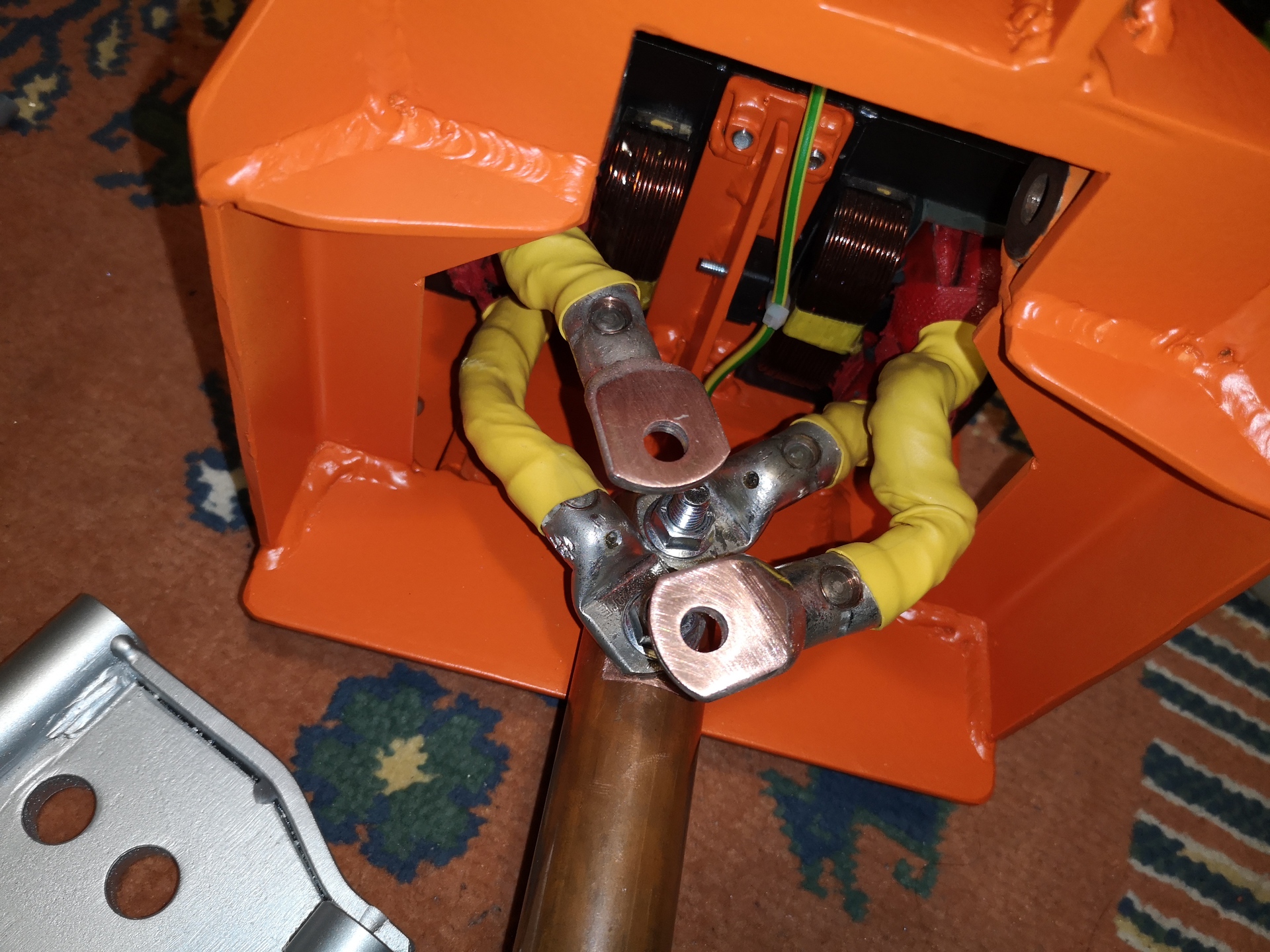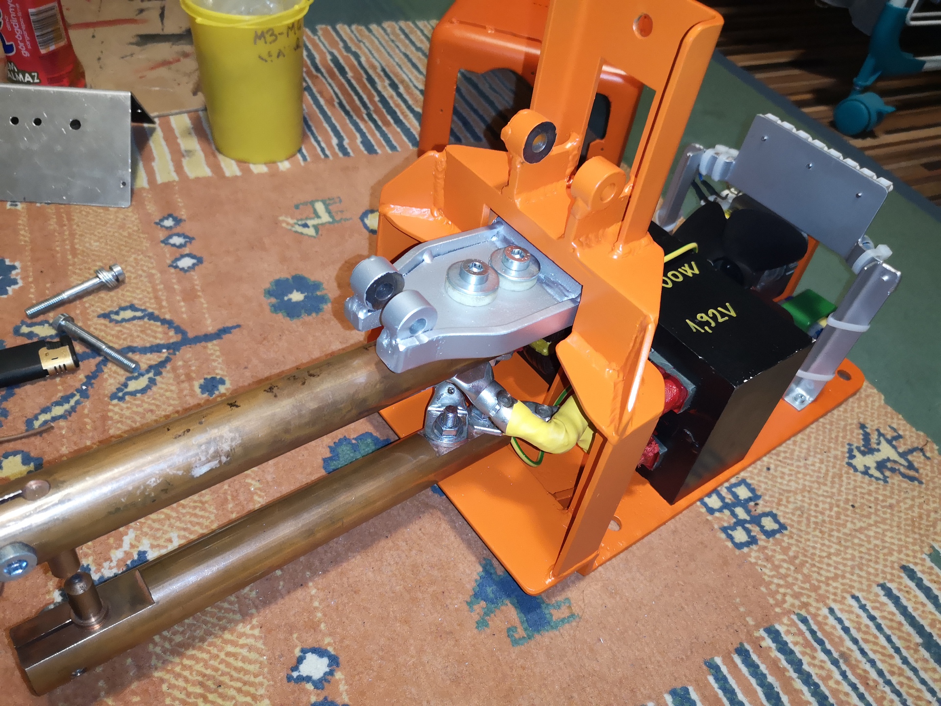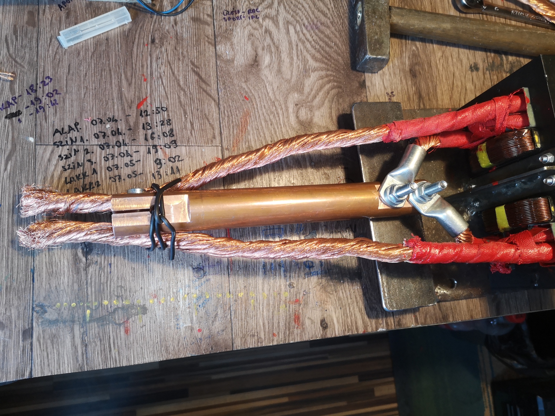 A mechanika nagyjábol keszen van, probahegesztettem, igaz meg csak kezzel szoritottam ossze az elektrodakat. Az áram eleg sok, 2000A korul van.