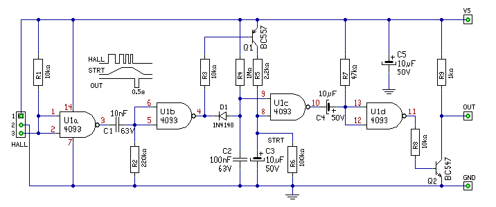 Akkor valami hiba van. A kapcsolásban a C1*R2 egy trigger. Az U1b kimenetén egy lefutó impulzus jelenik meg minden hall jelváltozására. Ez részben sütögeti ki C2 kondit, így az csak akkor tud feltöltődni, ha a bementi impulzusok megszűnnek. A C2 100ms alatt tud feltöltődni, tehát a bementi jelnek ennél sűrűbben kell érkezni, hogy ne legyen "impulzus kimaradás jelzés".
