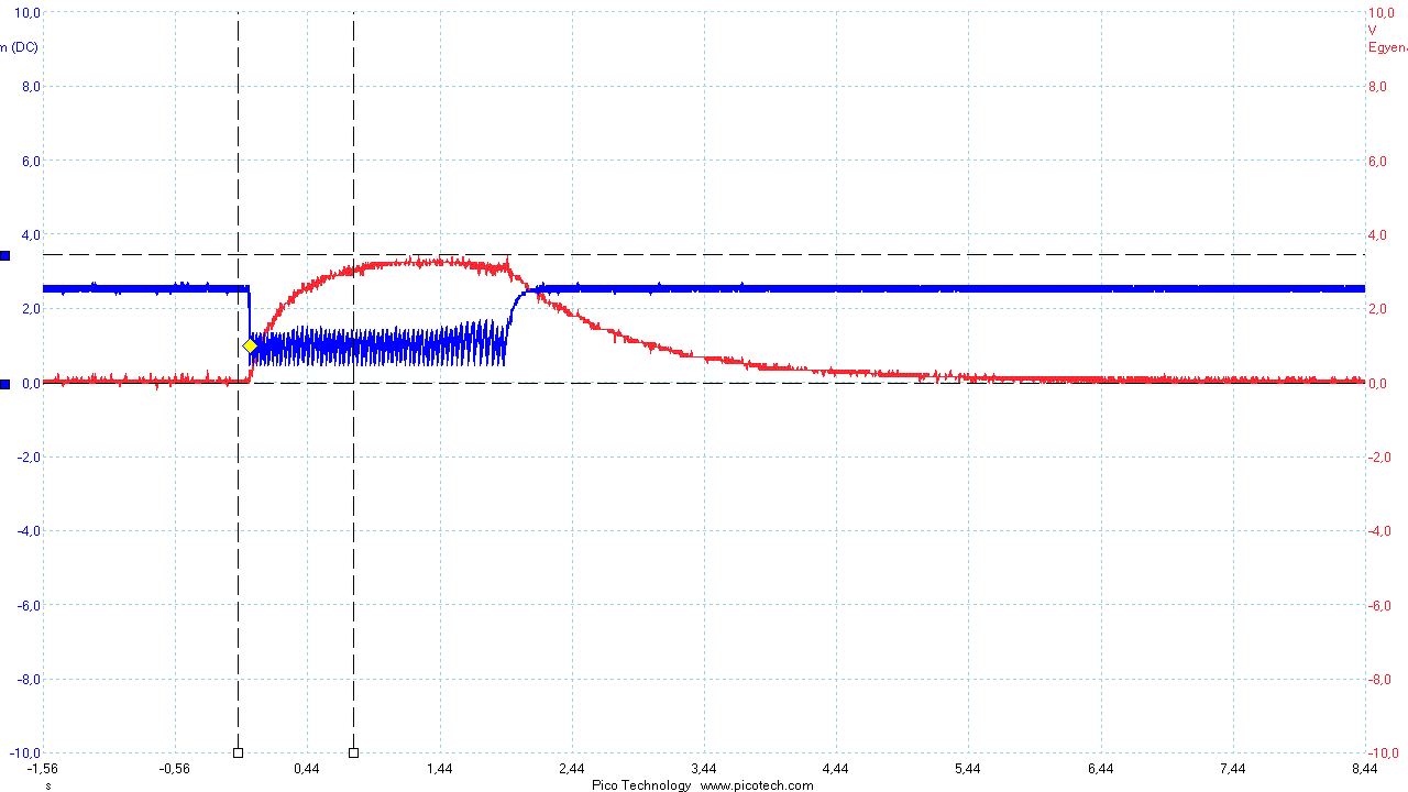 A 8 és 9 lábon szépen látszik a töltés kisülés. Mindig ugyanolyan a görbe, mégis van, hogy nem ad kimeneti impulzust a 10 lábon. Ez többször egymás után is bekövetkezik.