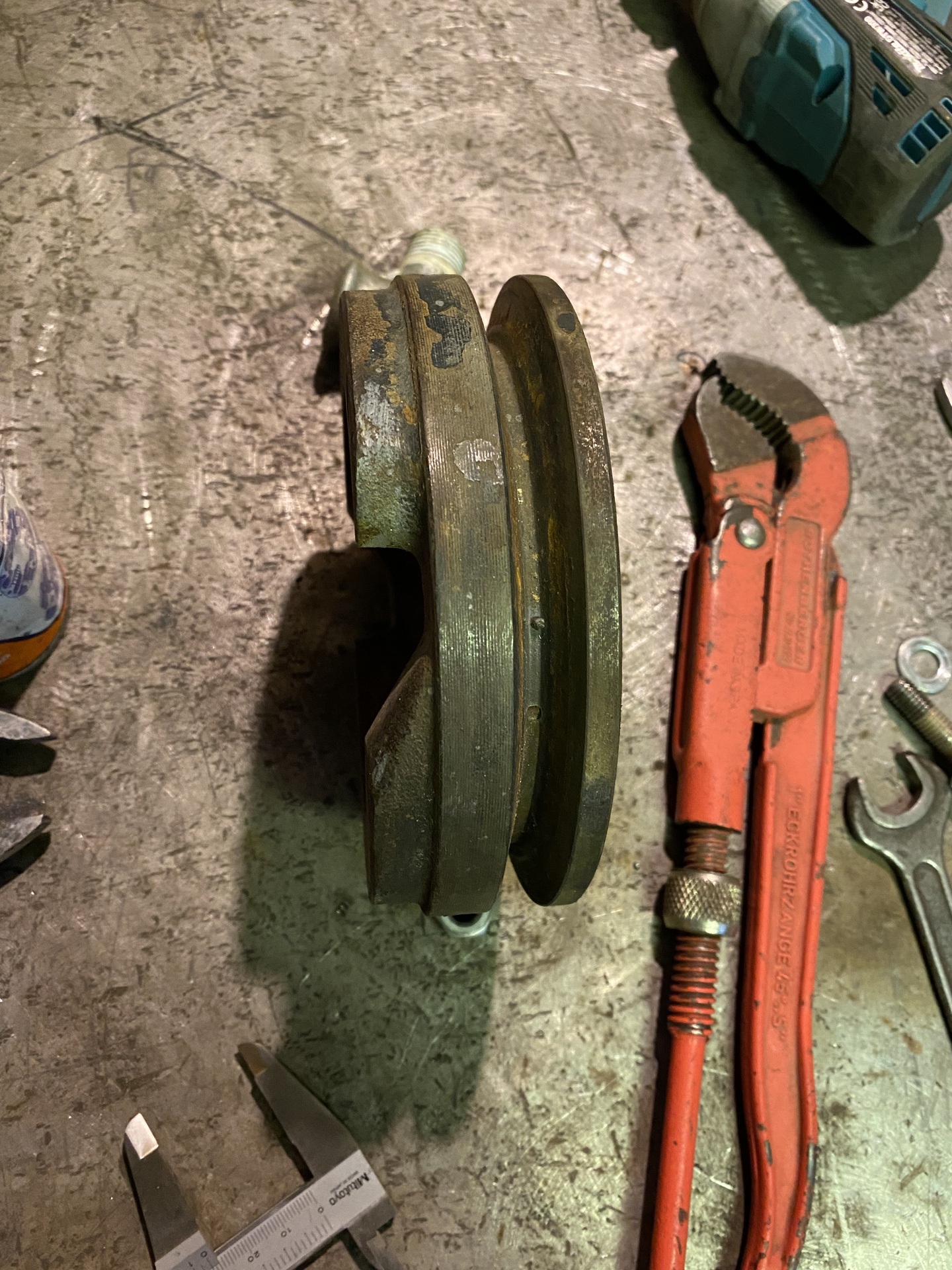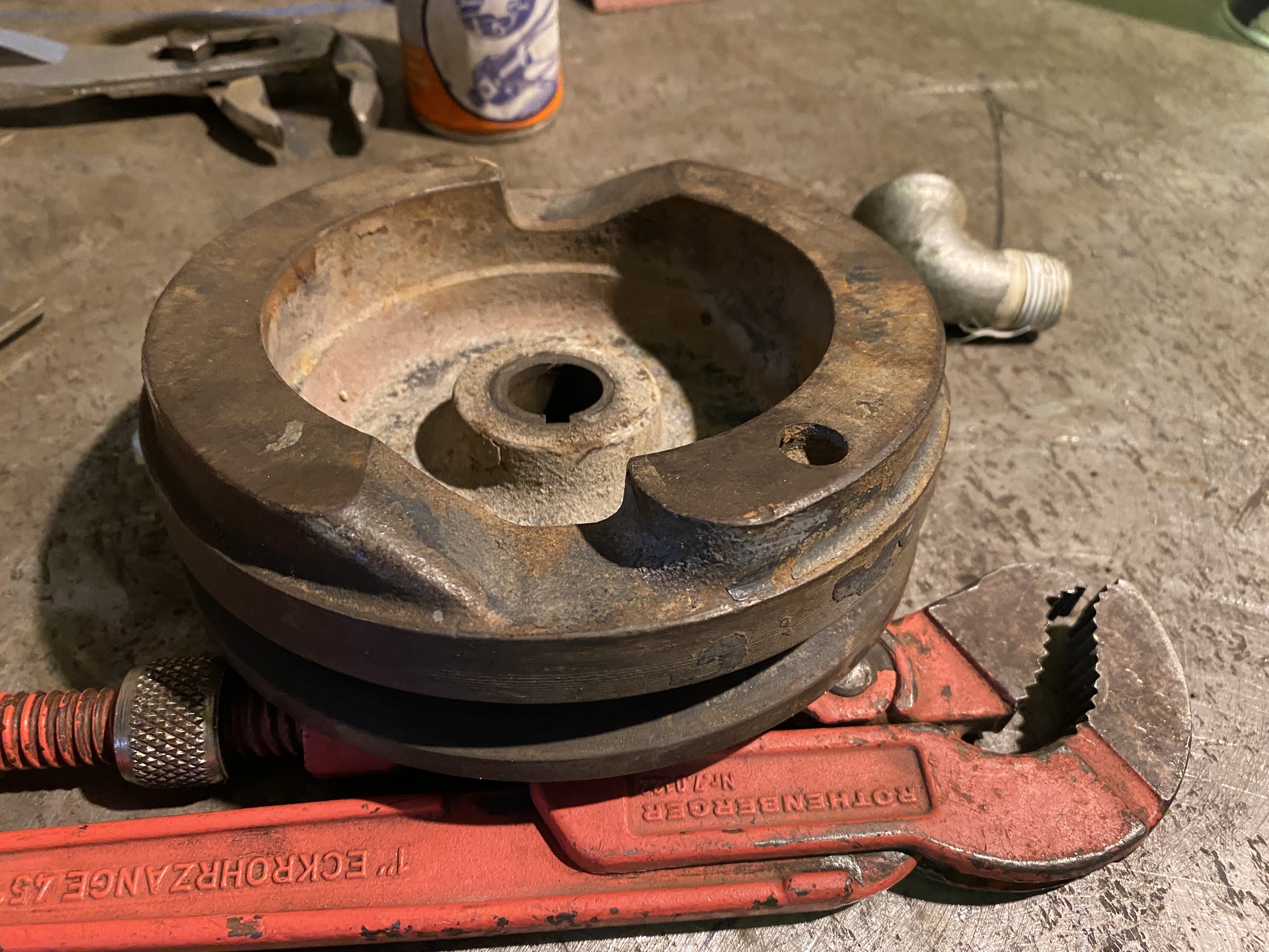 Közben megnéztem a motoromat, rosszul emlékeztem, 2830 a motor fordulatszáma, úgyhogy jóval kisebb ékszíjtárcsát kell rá kerítsek. A kompresszorfejen egy 25 centis ventillátoros tárcsa lett, úgyhogy kb 9cm átmérőjű kell a motorra, hogy kiadja az 1000fordulatot.