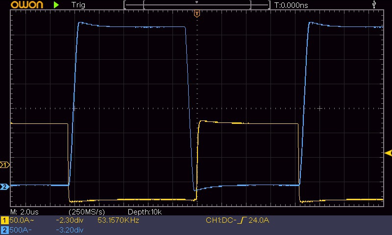 Ezek a hullámformák teljesen elfogadhatók. Esetleg a rezonáns kondival lehetne kísérletezni, hogy terhelt állapotban FET-ek kapcsolási pillanatai közelebb legyenek az áram nullaátmenetéhez - de akár így is maradhat, mert ránézésre ZVS-ben megy a táp, és hatásfok szempontjából ez többet jelent, mint a ZCS (persze akkor a legjobb ha megmarad a ZVS és a ZCS-t is közelíti).