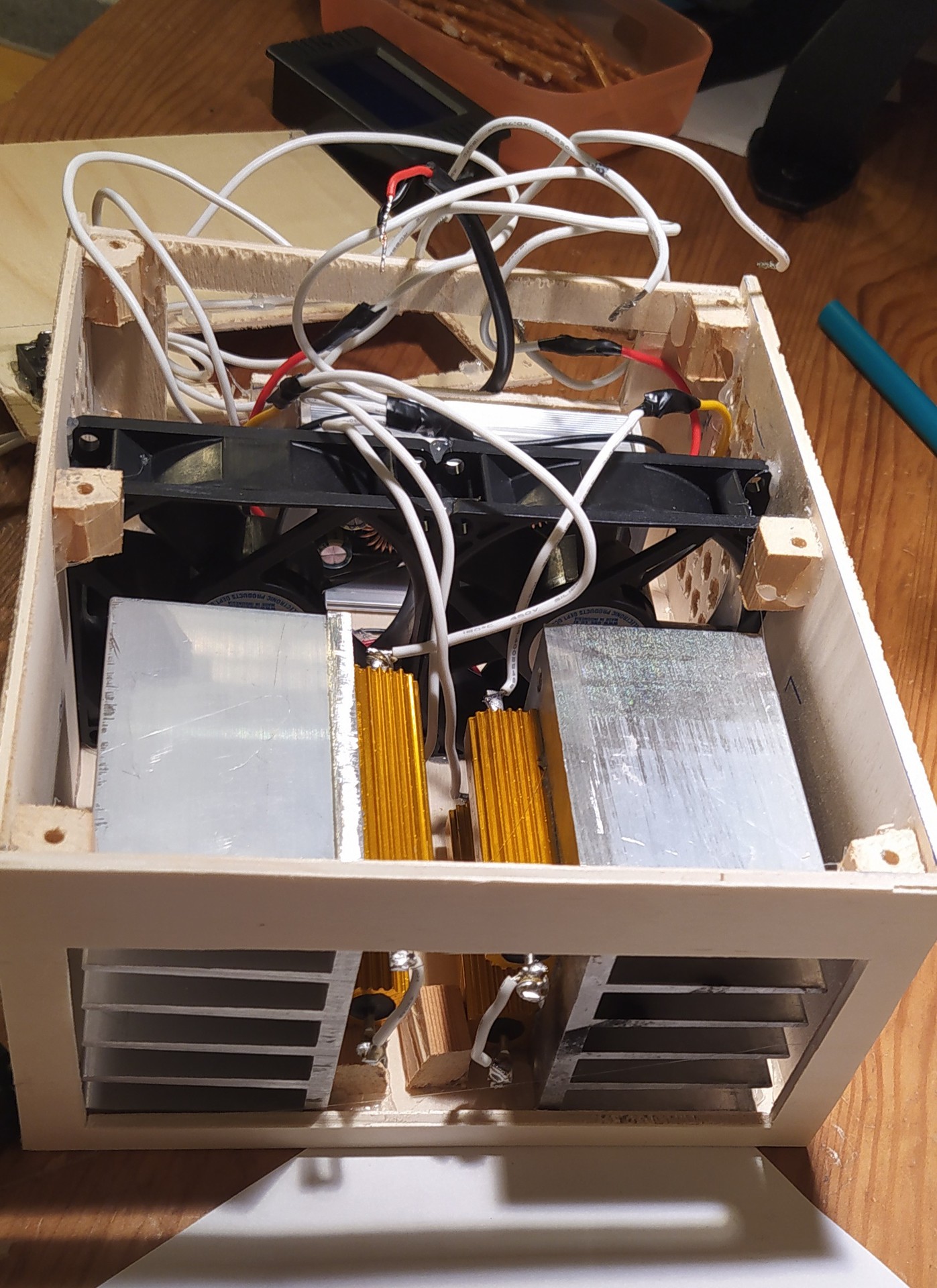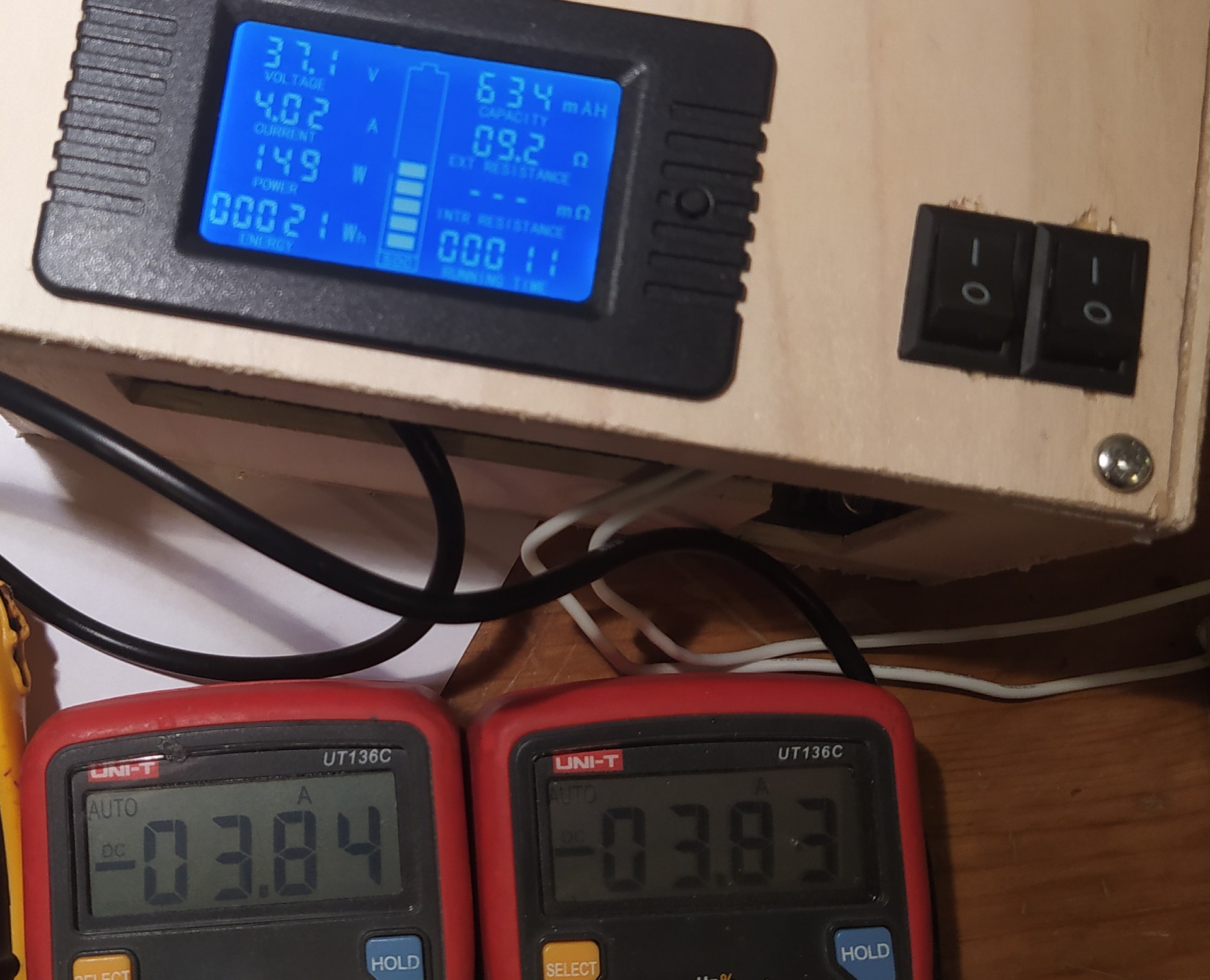 A terhelés jól működik, 24-72V bemenőből állít elő 2db dc-dc konverter stabil 2x 12V-ot, 10A-ig használhatóak, ezek után teljesítmény ellenállások (1db 1Ohm sorosan, konverterenként), amik melegen nagyobb értékűek lesznek, így jelenleg 70W-tal vagy 140W-tal tudok meríteni (kapcsolóval választható). Tervezem a bővítést, rendeltem 1.5Ohm-ot, ebből 4db-ot használva, plusz 2db dc-dc konvertert beépítve meg lesz a 350-400W. Így pl. egy 1000Wh-s akksit le lehet kb. 3 óra alatt meríteni.