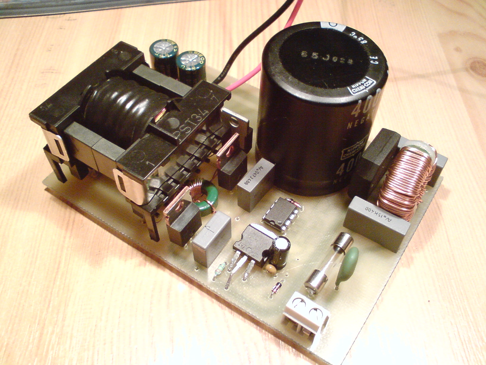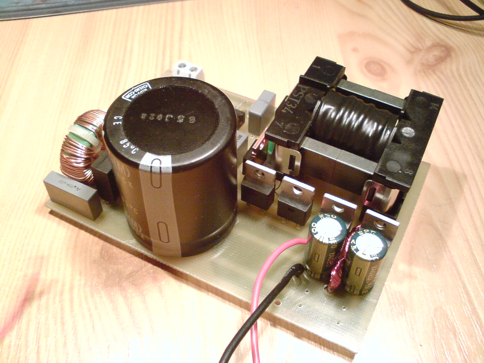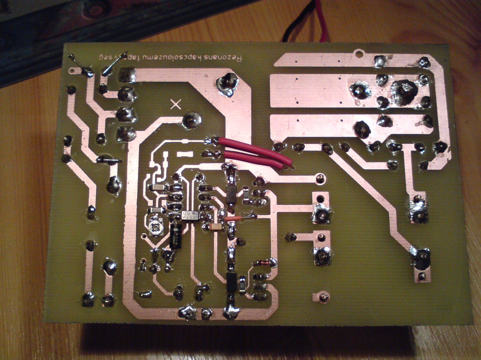 Elkészültem a rezonáns kapcsitápommal. Sikerült egészen jól beállítanom a frekijét, úgy hogy 190W terhelésnél a kimenőfeszültség az üresjárási feszültségének a 92%-a; 250W-al terhelve pedig a 88%-a. Hűteni semmit sem kell, csupaszon is hűvösek a fetek, a diódák pedig terheléstől függően langyosodnak. (Megjegyzem: ETD-34 (0,96cm^2) 60k járatva elég szép teljesítmény.) Remekül működik, nem kell neki segédtáp, és kiegészítettem 1 kis rövidzárvédelemel v. túlterhelésvédelemmel. (kinek hogy tetszik) Ugyan még nincsen bekötve, de ha szükség lesz rá akkor megvan a helye a panelen. Erősítő mellé szerintem kiválóan alkalmazható. A képek nem a legjobb minőségűek, sajnos csak mobil volt kéznél.