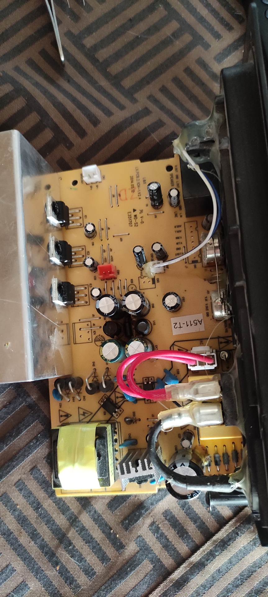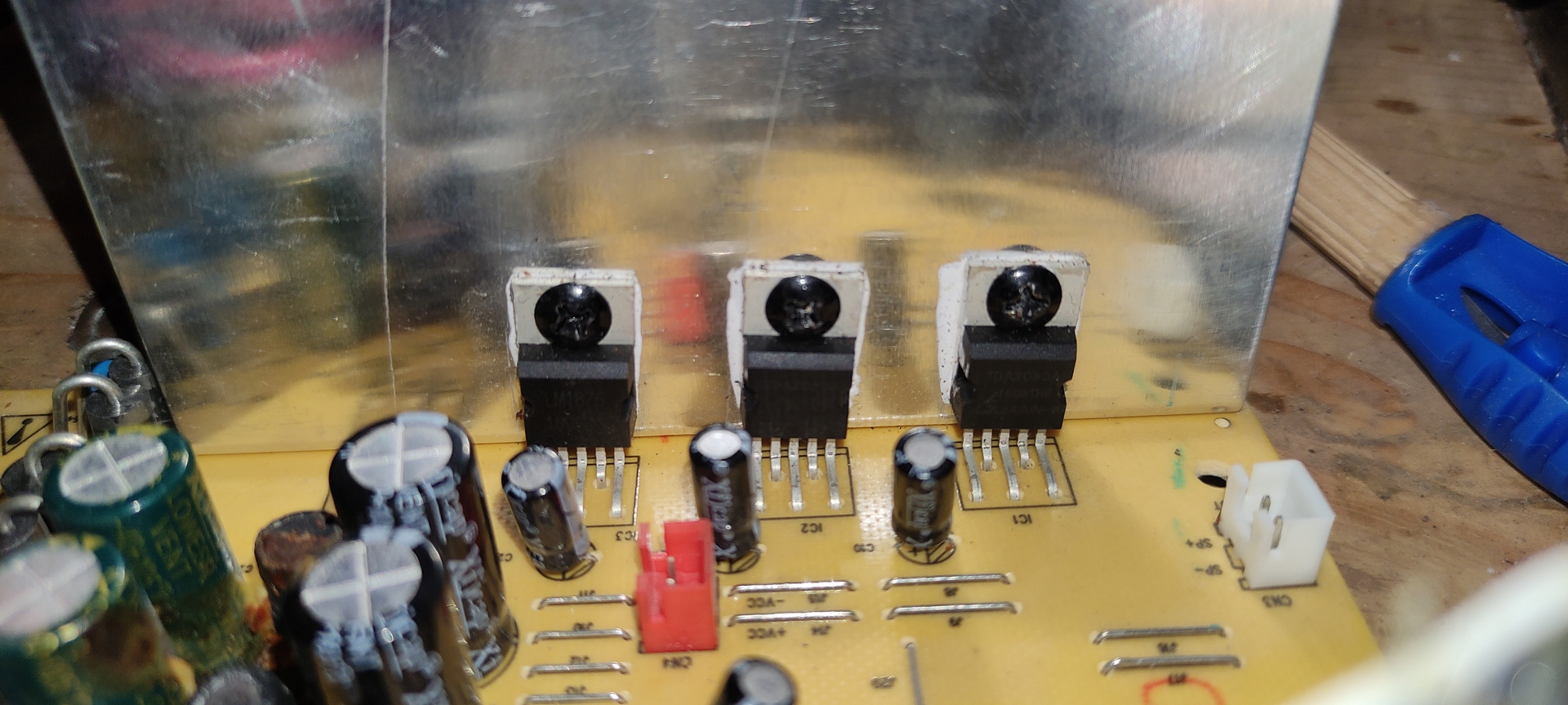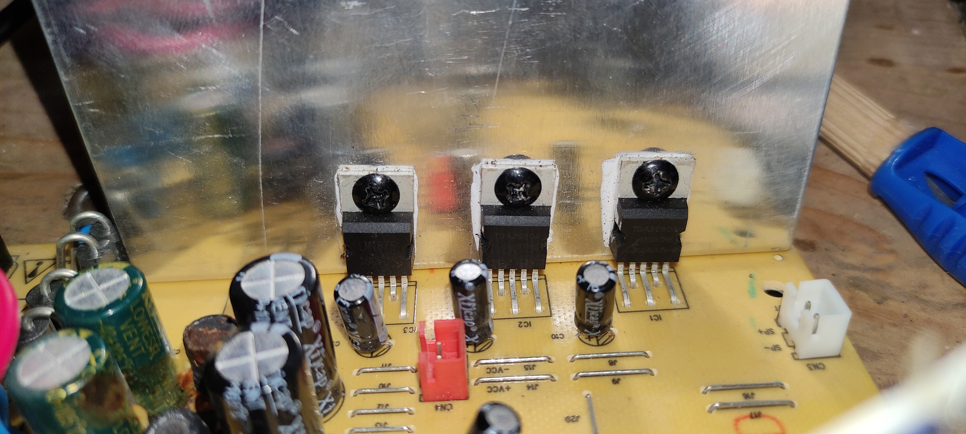 Sziasztok azzal a kérdéssel fordulnék hozzátok hogy adott lenne egy végfok erősítő.. igazából ez egy 2.0 ás hangfal szett belseje... az lenne a probléma hogy nem szól kiforrasztottam már mindhárom ic-t egy LM 1875 és kettő TDA2030 as volt benne , rendeltem már belőlük neten , rájuk mértem és az mért adatok szerint sajna jók viszont sikeresen letöröltem véletlenül az egyiknek a lábát tehát emiatt kellene rendelnem újat de nem fogja orvosolni szerintem a hibát ... amit még észre vettem hogy van a bekapcsológomb .. (az egyik képen látszik) nos ez a gomb "pislákol" , kb olyan mint a gyertya .. tehát lehet rossz helyen keresgélem a hibát .. kérdésem az lenne hogy legyszii valaki tudna segíteni merre felé keresgéljek, szerintem ez a bekapcsoló gomb vibrálás lehet egy kiinduló pont ?