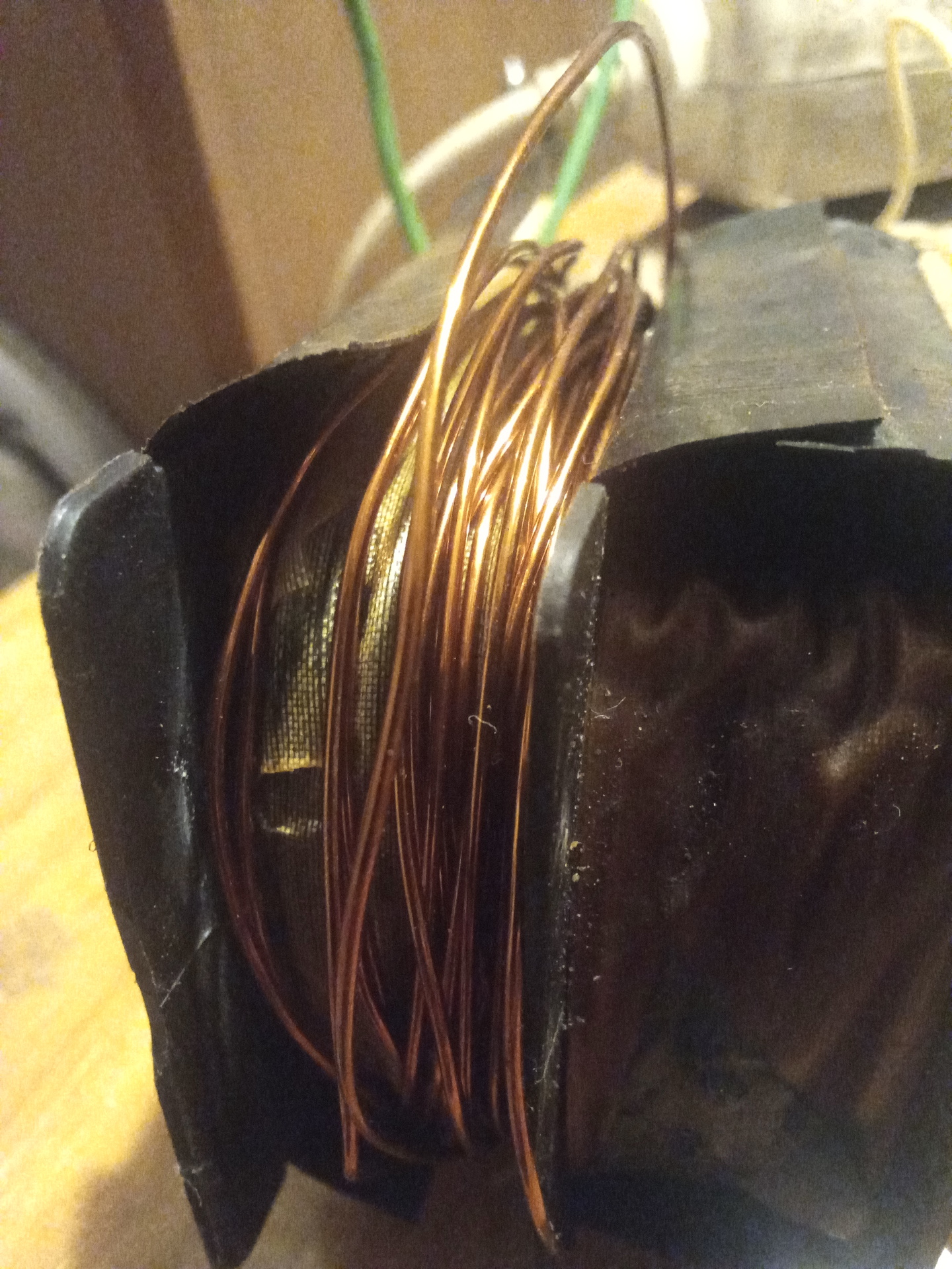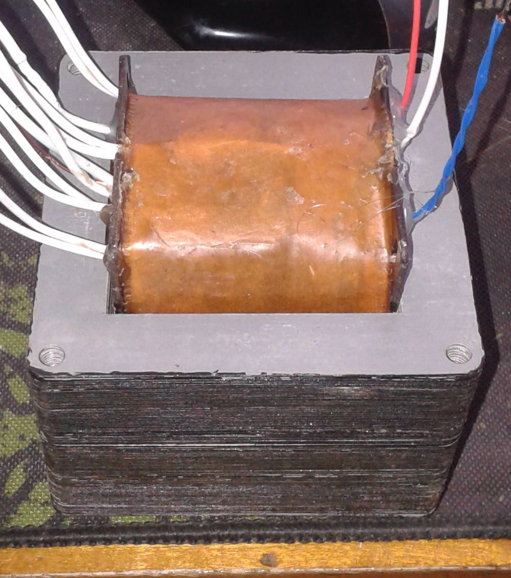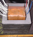 Maga a trafó aláméretezve kb. 320 VA , 220V betápnál üresjárati áram 45mA és összefogatás nélkül sincs hangja, rezgése. Mivel igazából a primer huzal - szerintem - egy erősítőnél alá méretezhető, így a kiszámoltnál vékonyabb, 0.56 mm-eset használtam. A szekundert viszont a DC ellenállása miatt vastagabbra vettem, a várható áramfelvétel - A osztály - 0.24A, ide D=0.45mm-est tettem, főleg, mert nem volt kis orsóm áttekerni a 0.4-est a géphez. A DC ellenállás 21 Ohm lett. A leendő végcsövek fűtése a 6550-nél 1.6A, ide 0.95 mm-est tettem, ilyen volt. A előcsövek majd másik trafócskát kapnak, ez csak anód és a 4 fűtés. A lényeg, bizony príma anyag ez a BEAG vonali trafó vas. Csak már nehéz hozzájutni. Mivel ennek a trafónak maximálisan a környezeti hőmérsékleten kell lennie, így a méhviasz- paraffin kombóval impregnálva. A pr/sec közt rézfólia árnyékolás.