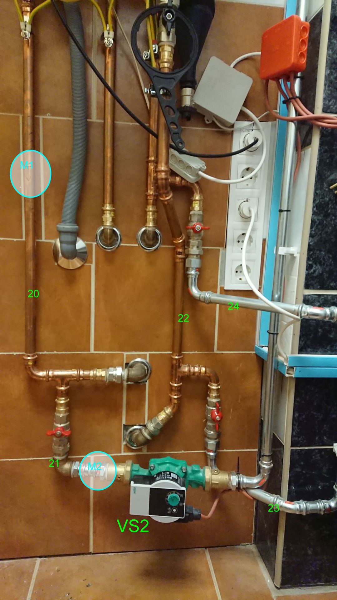 A hőcserélő másik oldalán is van egy szivattyú. Lehet ide kellenek még visszacsapó szelepek is (M1, M2 helyekre). Egyenlőre egy golyóscsappal lett megoldva hogy a gázkazán felől ne menjen viz a hőcserélő felé. Viszont a vegyes felől lehet hogy mehet viz a gázkazán irányába.