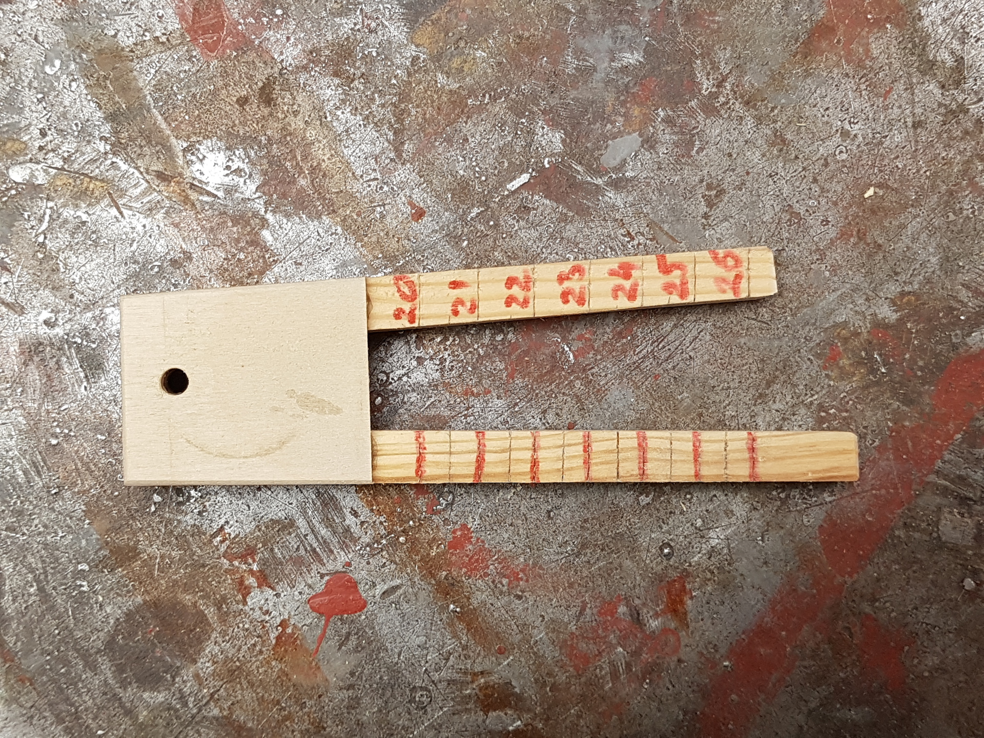 Ezért az éppen kezembe kerülő lécekből csináltam egy kaliber-villát, amit kalibráltam néhány méretre. Ki is próbáltam, és várakozáson felül jól működik. Nagyon gyors a mérés, jól látom szemüveg nélkül, és később visszamérve teljesen pontos az eredmény. Egyszóval bevált.