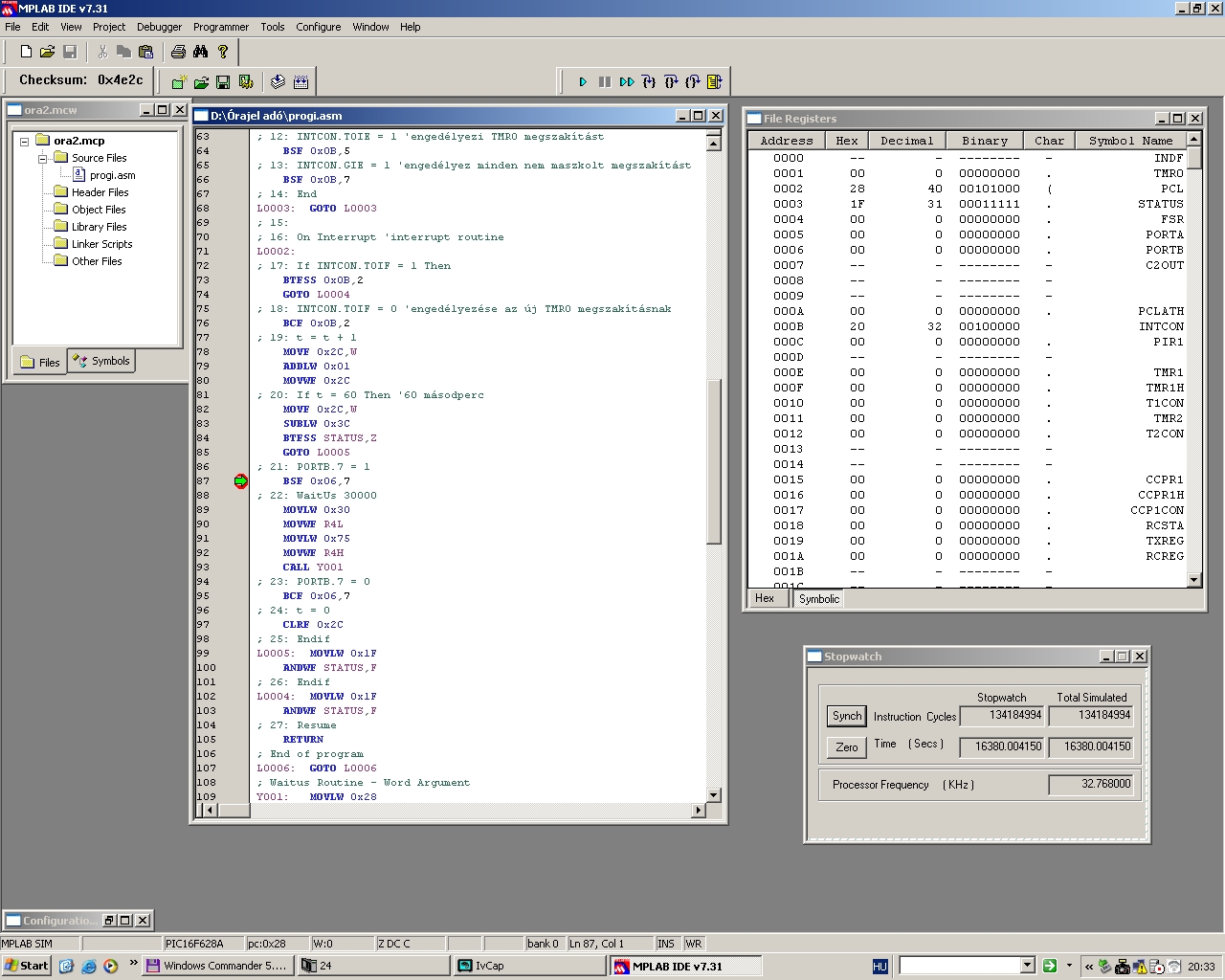 Jó hírem van! A módosított program (progi.bas) pontosan müködik. Leszimuláltam. Szimulációs eredmények lent mellékelve. A kezdeti kis eltérést tovább görgeti,de nem összegzi. A eltérés a páros és páratlan értékeknél két különböző érték, de nem tendencia hanem csak két különbözeti érték váltogatja egymást, tehát abszolút pontos. Sőt megépítettem az a kapcsolást amit 5hónappal ezelőtt kézzel felvázoltam neked csak az RB7-re egy ledet tettem egy 330ohmos ellenállással. 10órát üzemelt tegnap óta a kapcsolás. Még reggel is szinkronba villant a karórámmal. Neked is ezt javaslom hogy először próbáld ki leddel. A másik gondolatom, biztos hogy a config biztiket jól állítottad be égetéskor?