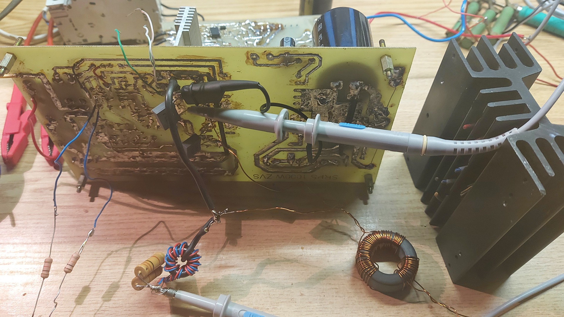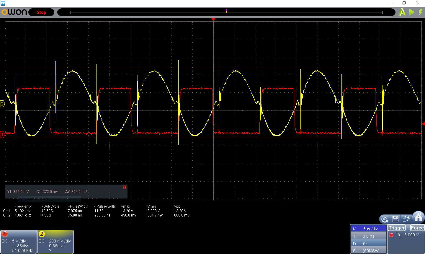 Állítsam hozzá a frekvenciát? És mértem 2us/DIV-ben... Apropó: Megmértem a betápom: Terhelve leesik a leválasztó trafón 180V-ra, a DC pufferelt 210V...