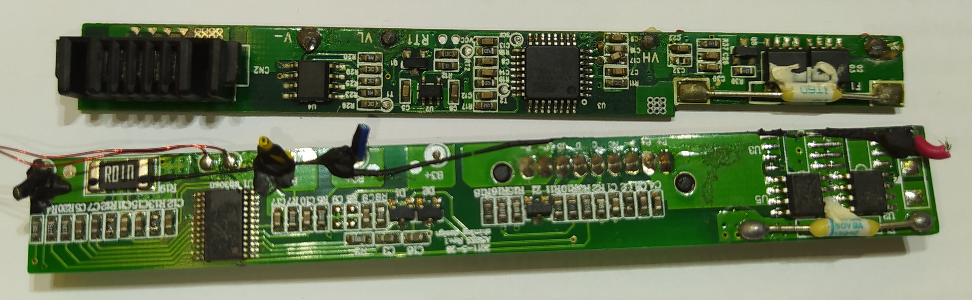 A hoverboard nyákján az SMD IC-nél pont vannak 100 Ohm-os ellenállások, mindjárt ránézek, hogy ezek sorban vannak-e az IC bemenetével, hogy a kondival szűrőt képezzen, vagy mit csinálnak. Egyébként az IC dw01a SOT23-5 védelmi IC.