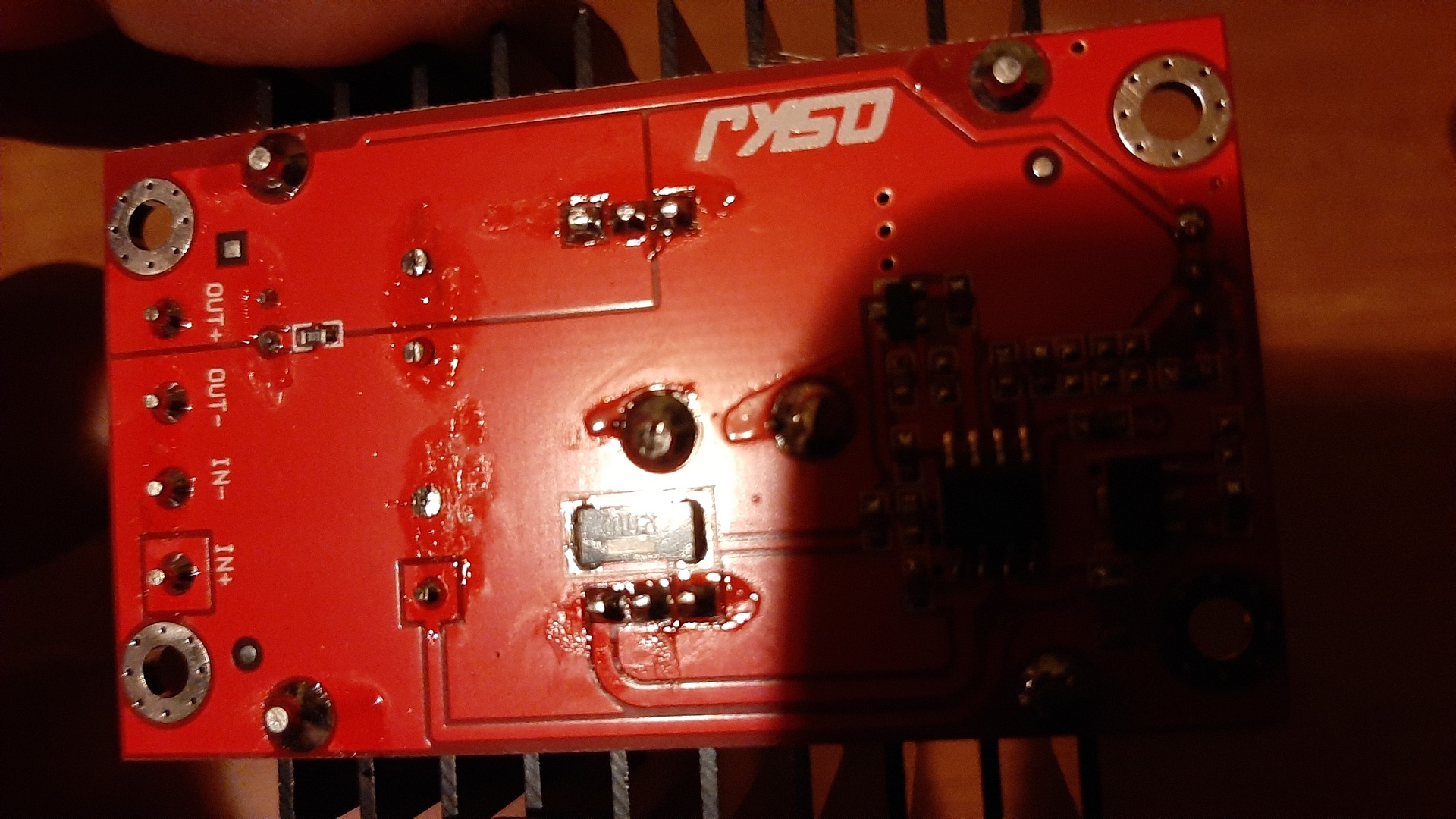 A problémát a hűtőborda tekintetében inkább az jelenti, hogy a - kiszáradásra egyébként is hajlamos - elkók közvetlenül a borda mellé vannak beépítve. (Túl a nyilvánvaló hiányosságokon, mint az elcsúszott szigetelő lapka, a "rövid csavarhúzó", és a gyanta-maradvány a panel forrasztási oldalán.)