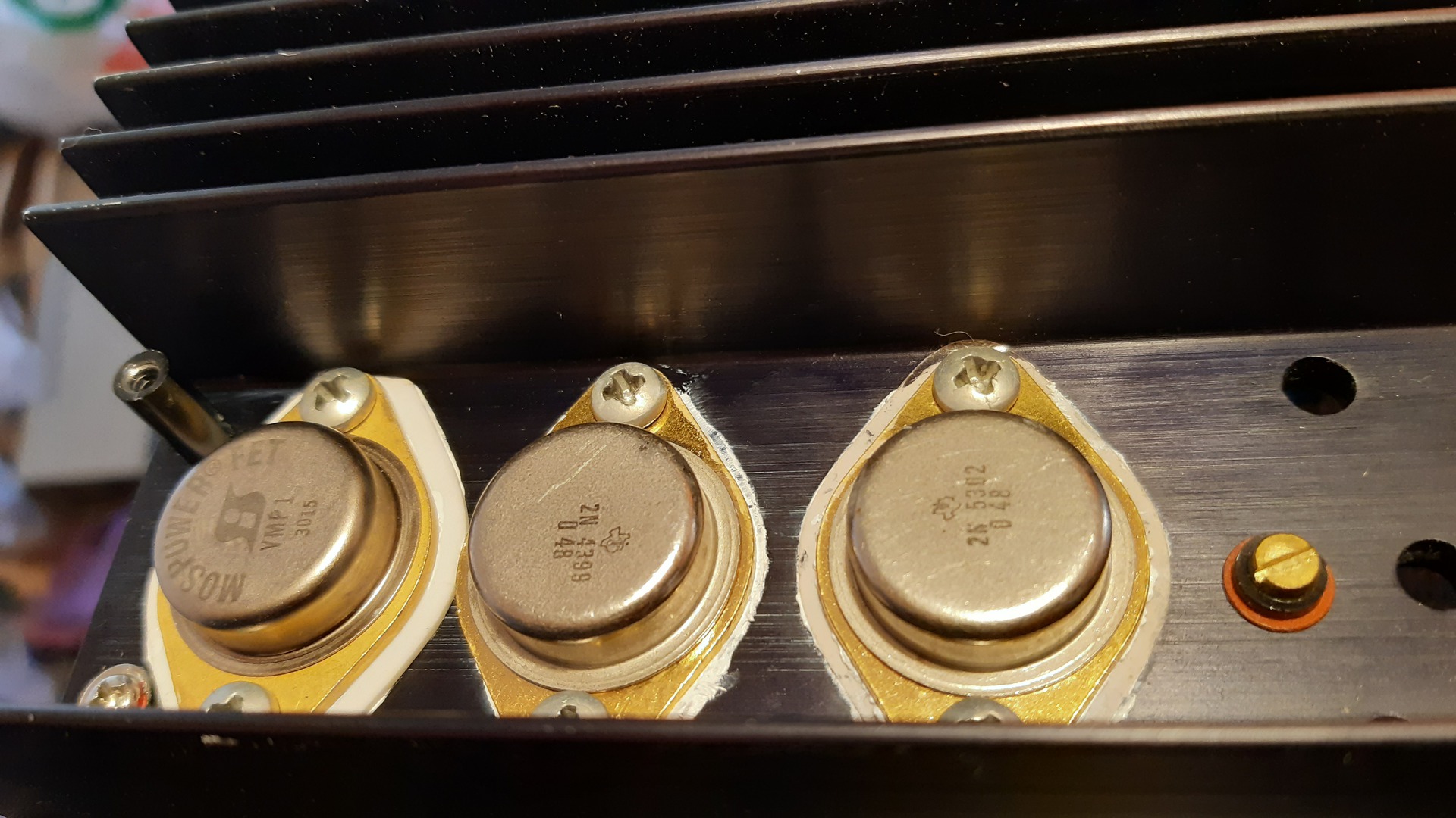 A mellékelt fotón a középső PNP tranzisztor kollektora a testen van, nincs szigetelés a hűtőborda és a TO-3-as tokozás között. Így ott a TO-3 tokozás/csavarok/ hűtőborda hőmérsékletét jól lehetett indikálni, mivel itt korábban pont erről volt szó.