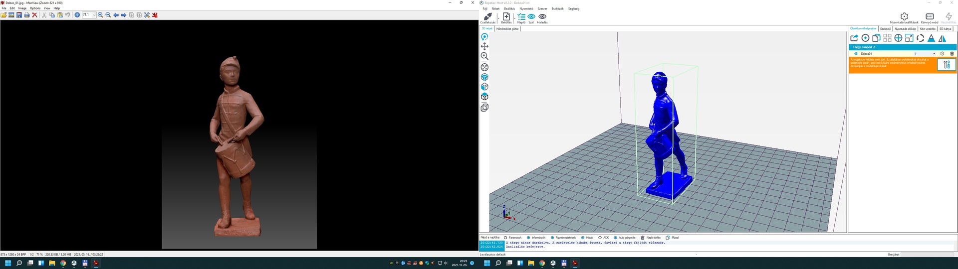 Lenne egy szobor amit ki kéne nyomtatnom.4 gondom van vele. 1. 250-Mb igen részletes STL állomány 3D szkennelés után. 2. A szeletelés hibába fut, javítani kellene a fájlt hogy szeletelhető legyen.(Repertier-Host) használok. És javítás közben kifagy mert annyira sűrű a STL. 3.Eredetlieg 40cm magas. És kedves munkatársam elképzelése az lenne hogy 90cm magas legyen. Tehát 2X-es nagyságba szeretné kinyomtatni. 4. Nyomtatóm magaság 25cm. És 4 fele kéne vágni. 5% kitöltöttségre gondoltam. A munka fájlt Google fiókból tudom megosztani aki szívesen megtekintené. A hozzászólás módosítva: Nov 23, 2021