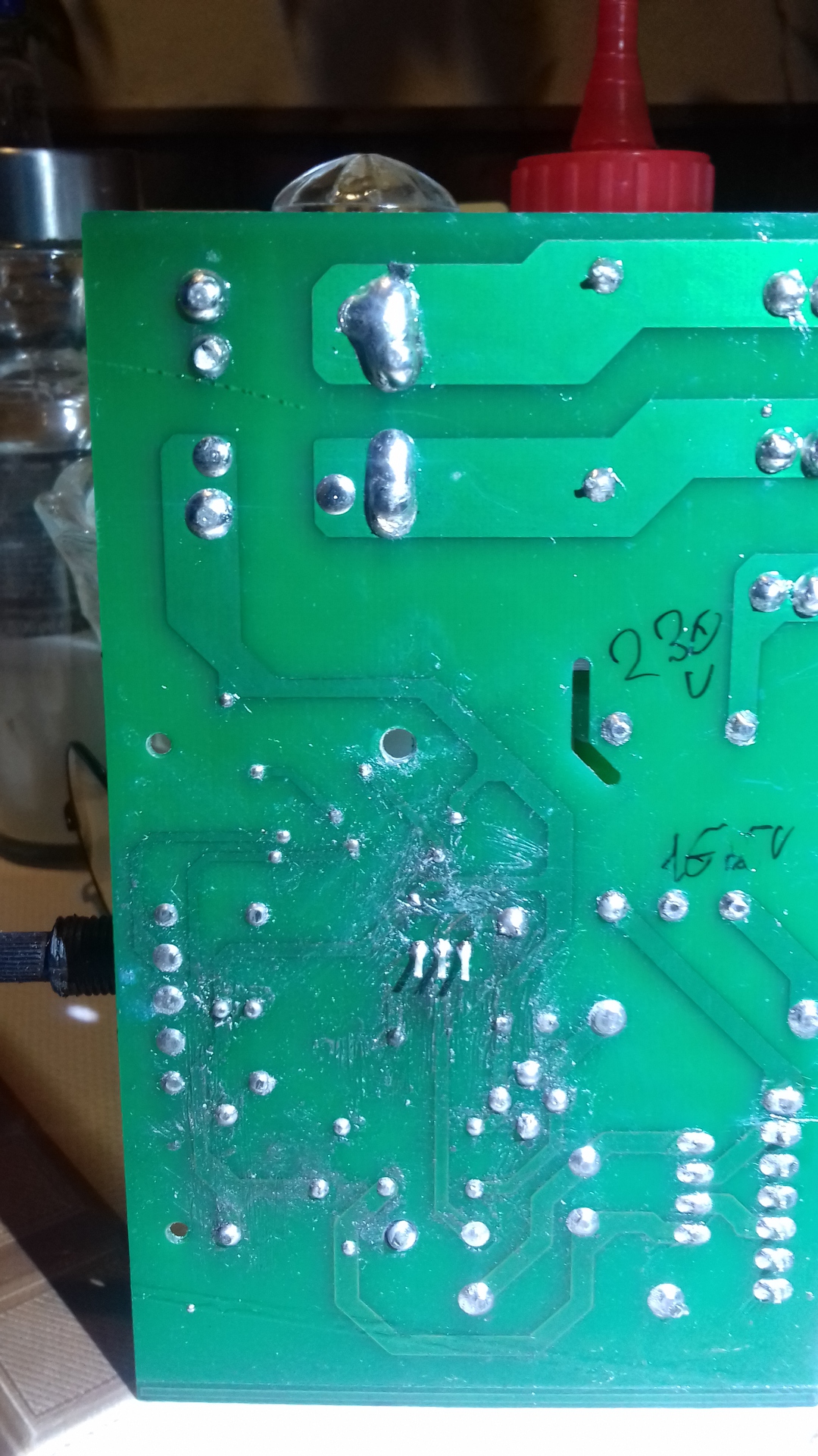 Sajnos elég sok a furatgalván. A három 1 Ohmos ellenállás a Fet source lábán a másik a relén és a kisebb egyenirányítón negatívján van. Nem egyszerű nyák! A Fet drain lába a nagyobb egyenirányító és a puffer kondenzátor negativ lábán van.