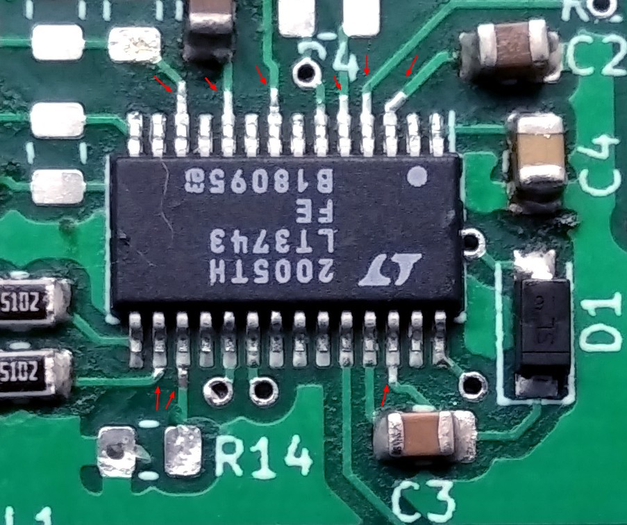 A piros nyilak mutatják, ahol az ón az IC lábaitól továbbfut a réz felületen. Eredetileg természetesen csak a pad-ek voltak szabadon, forrasztás közben töredezett le a lakkréteg. Forrasztás: 290fokon, WP80 pákával. A 4rétegű NYÁK-ot ólommentes ónbevonattal gyártattam, és ólommentes ónnal forrasztottam CHIPQuick SMD4300 folyasztószerrel. Ilyet eddig csak egy magyar gyártónál láttam, de ott ránézésre is vékonyabb, vacakabb volt a lakkréteg.