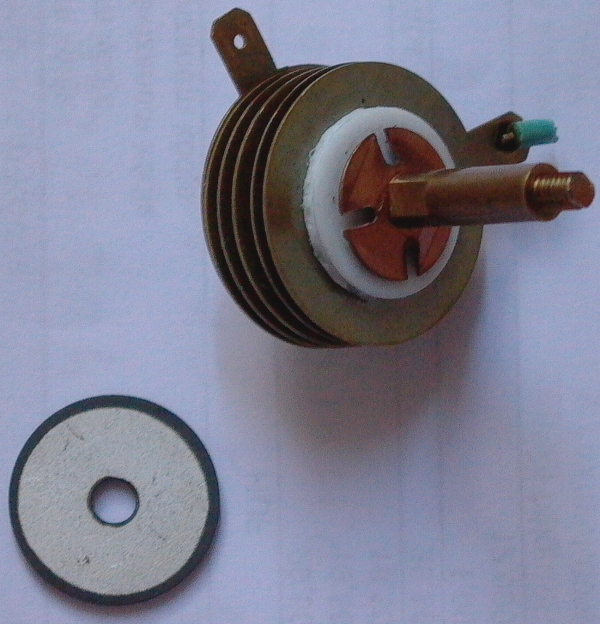 Ez vajon mi lehet? Egy régi hőmásolóból való. Próbáltam sokféle mérést végezni rajta de mindig szakadást mutat. A különálló lapka egy az 5 közül. Minden lapka után egy réz tárcsa van.