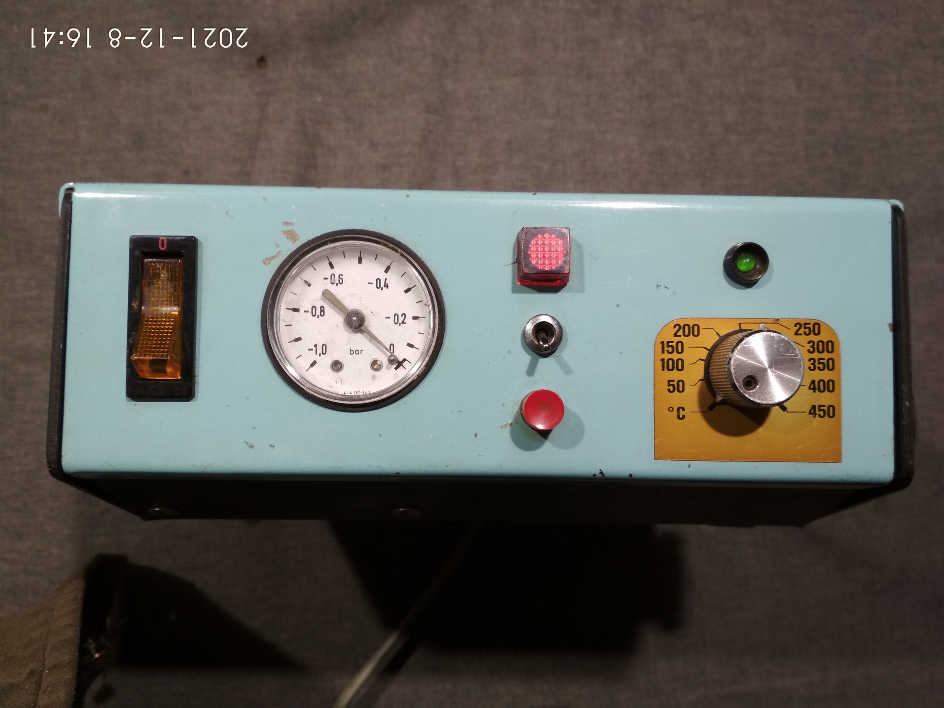 Amint látszik, előző gazdája alakított rajta egy kicsit. Most úgy működik, hogy a középső kicsi a főkapcsoló, az eredeti pedig kapcsolja a vákuumszivattyút. A szívást a gombbal lehet indítani, a műszer szerint -0,75 bar-t lehet elérni. Én nem tudom azt sem, hogy ez sok, vagy kevés. A kivezető csonk le van törve, de ahogy nézem, nem nehéz pótolni. Jobb oldalon a 2 piros banánhüvelyen 29 VAC van, gondolom a trafó nyers feszültségét vezették ki.
