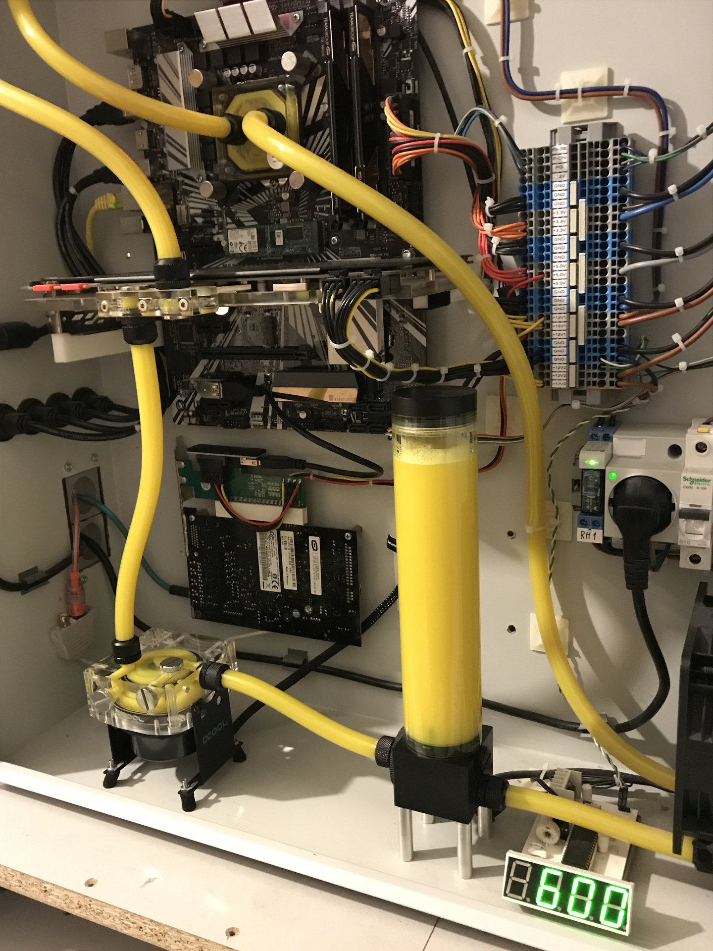 Ugye jól látom a folyadékkört: Bal oldalt alul a keringtető szivattyú, az rátolja a videokártyára, onnan egy 3 ventilátoros folyadékhőtő, majd a processzor, ismét egy 3 ventilátoros folyadékhűtő, majd a folyadék puffertartály. Mi az a kis modul a folyadéktartály bal oldalán, azt nem tudtam megfejteni.