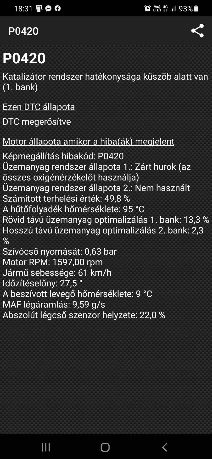 Az a pillanatnyi állapotot mutatja, amikor a kocsi a hibát generálta. Gondoltam valaki ért hozzá és tud tanácsolni valamit az értékek alapján, csak ezért tettem fel. 9 g os Maf 1500 on nem tudom jó e vagy rossz, laikus vagyok. Az ecu ekkor dobta a hibát. Laptoppal is néztük, nincs különbség, a motordiganosztikai lámpa világít újra, p0420. Hogyan kell újratanítani? Azt nem próbáltam. Köszi a tanácsot.