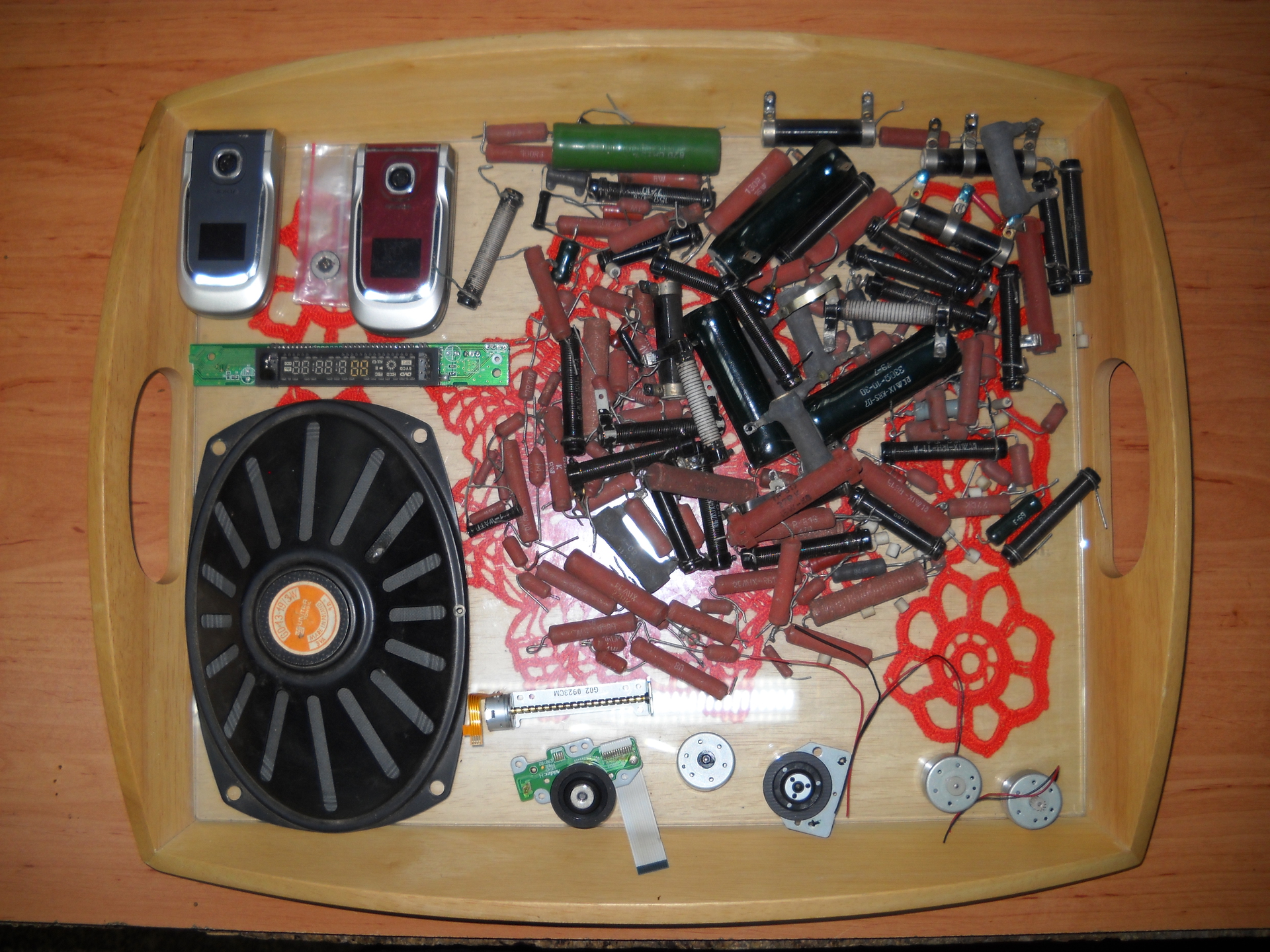 1. Régi nagy teljesítményű ellenállás, motorok, Nokia telefon, akku nélkül, vfd kijelző, hangszóró, tálcával együtt.