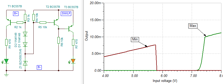 - Ha az R3-at közvetlen a zéner után tesszük, akkor az R1/R3 feszültségosztása megszűnik, 600mV-ot "megtakarítunk". Így a működés kezdete kb. 13.3V-ra esik.